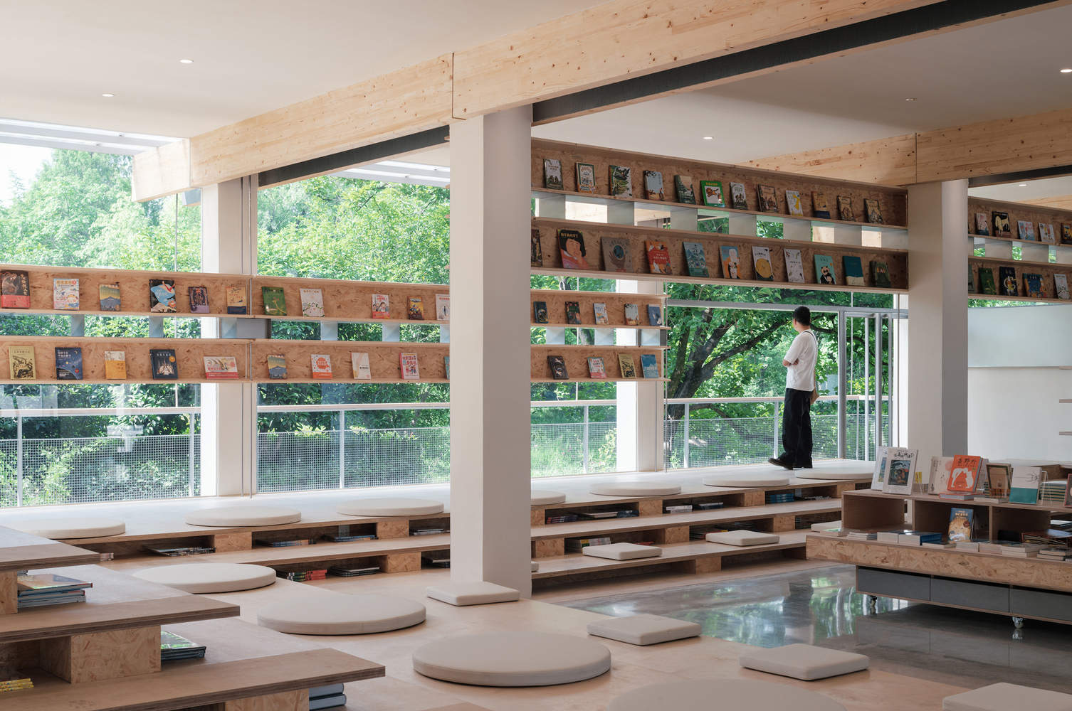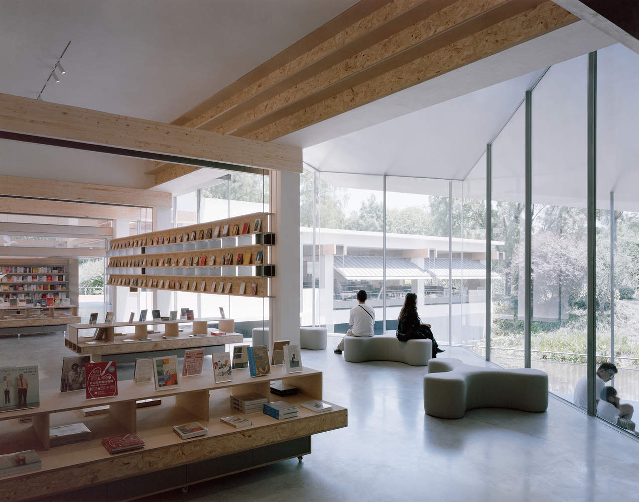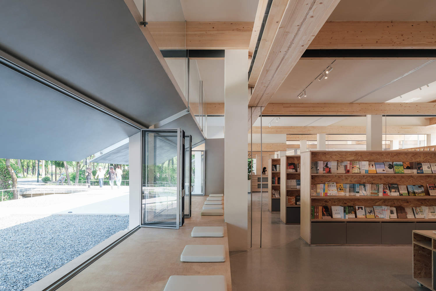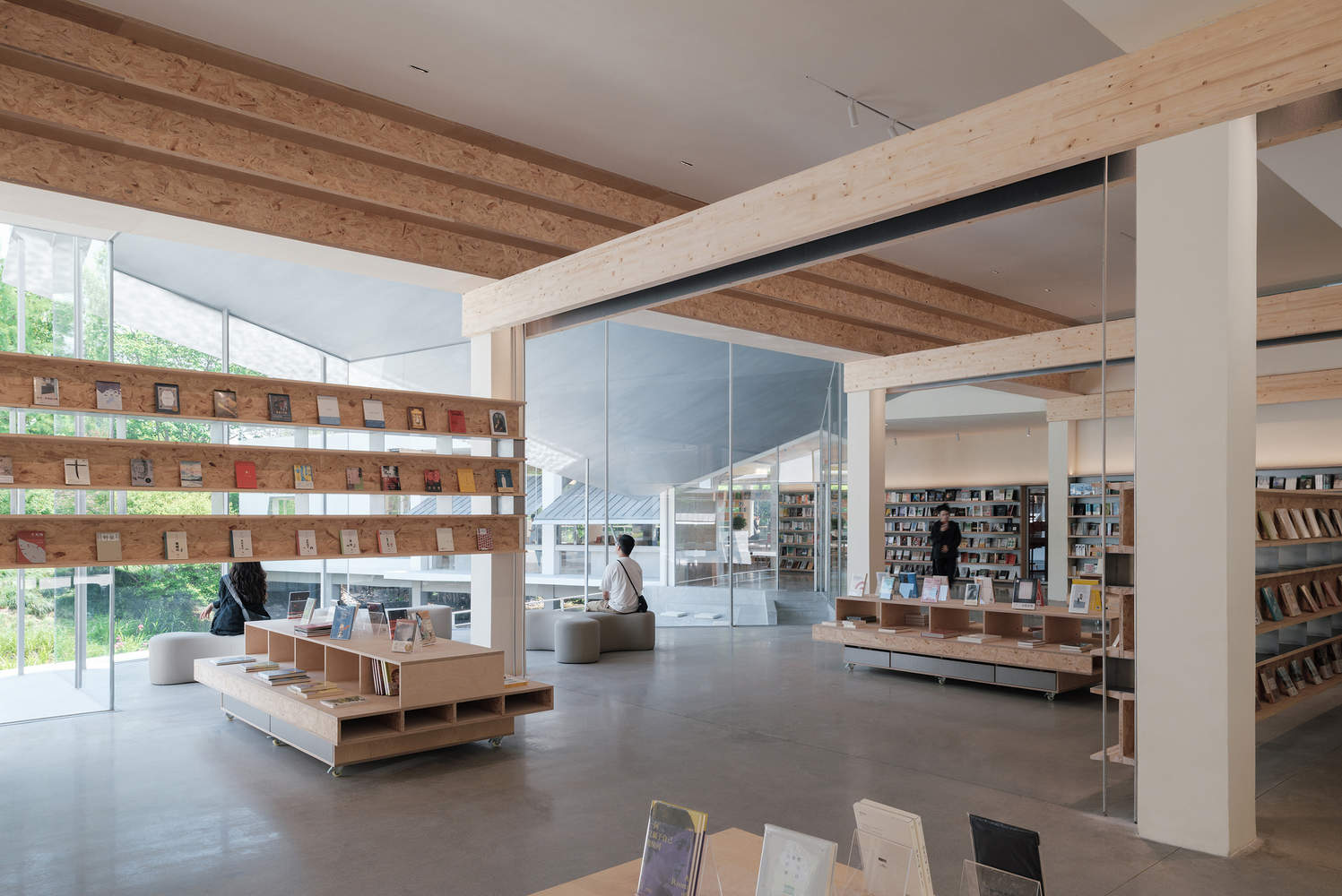 The six sets of book beams are staggered in height between the columns, forming a rich spatial interlocking effect with the wooden beam group. They float in the white space, defining a group of fields with ambiguous boundaries and open to nature. Xixi Wetland, as a secondary urban wetland in Hangzhou, is a place for nearby residents to take daily walks and ride bicycles. We have built a transparent and open bookstore on the wetland, allowing people to read books and nature at the same time, becoming a public place embedded in the natural life of the city.