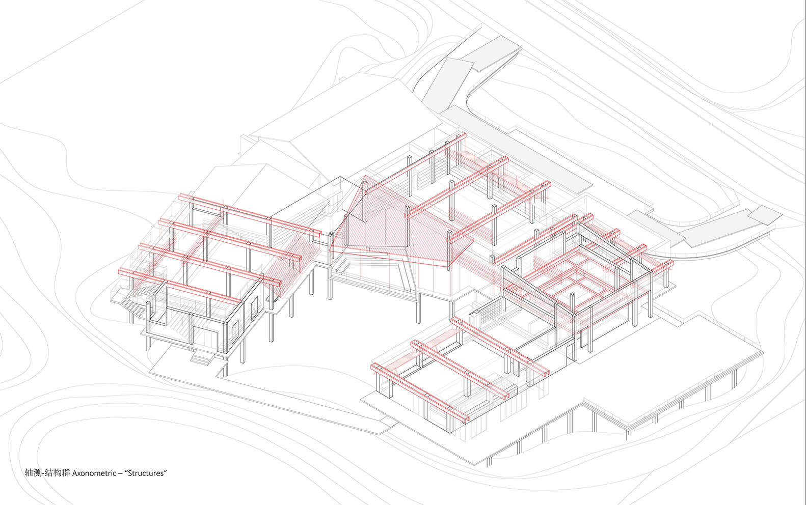 一层被规划为环抱水院、水平连通的空间。西侧纵向主空间容纳了书籍展销功能,北翼书吧为咖啡阅读区;南翼为阅读沙龙区,通过室外楼梯与二楼景观露台相连。剥离掉所有围护墙体,留下的是一组混沌而无意义的混凝土框架结构。一系列新“结构群”的介入,给原本混沌的结构强行赋以新的秩序,使其转化为与自然深度关联的空间场域。