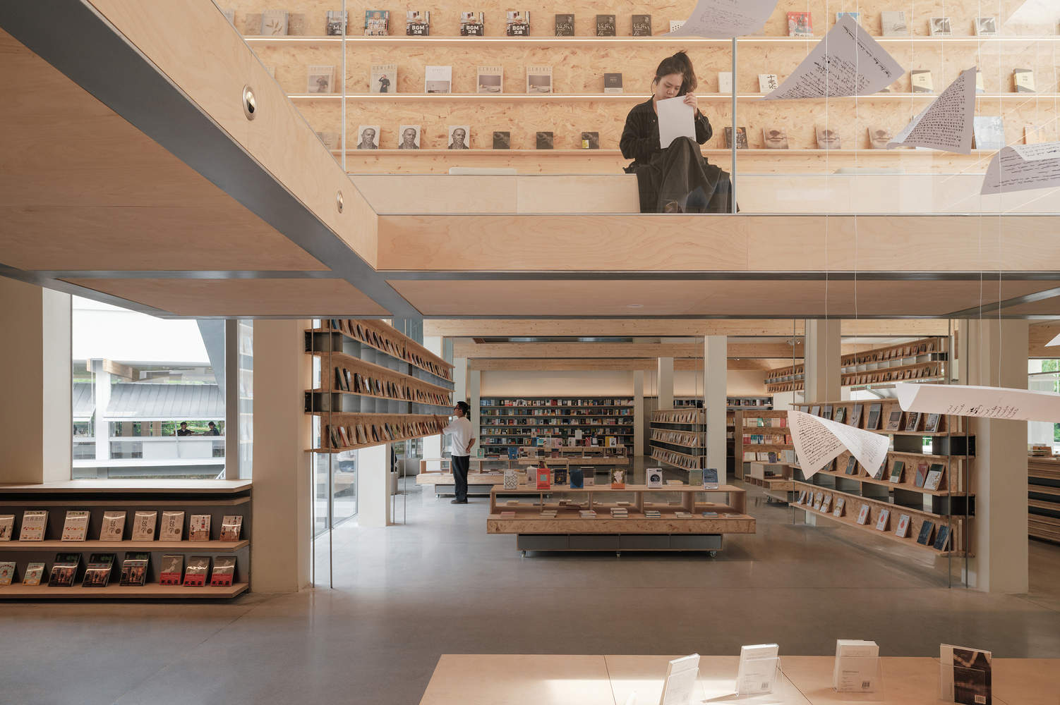 The mezzanine of the book tower breaks the conventional treatment of floor slabs. The steel beam mezzanine with a cross shaped layout is erected between the concrete columns and suspended downwards. The top surface of the I-beam is level with the wooden floor, presenting a horizontal element that is homogeneous with the wooden beam: at the end of the vertical space, the beam group is stacked downwards to release natural light. The silhouettes of people inside the book tower were intercepted by horizontal wooden beams, creating a floating landscape.