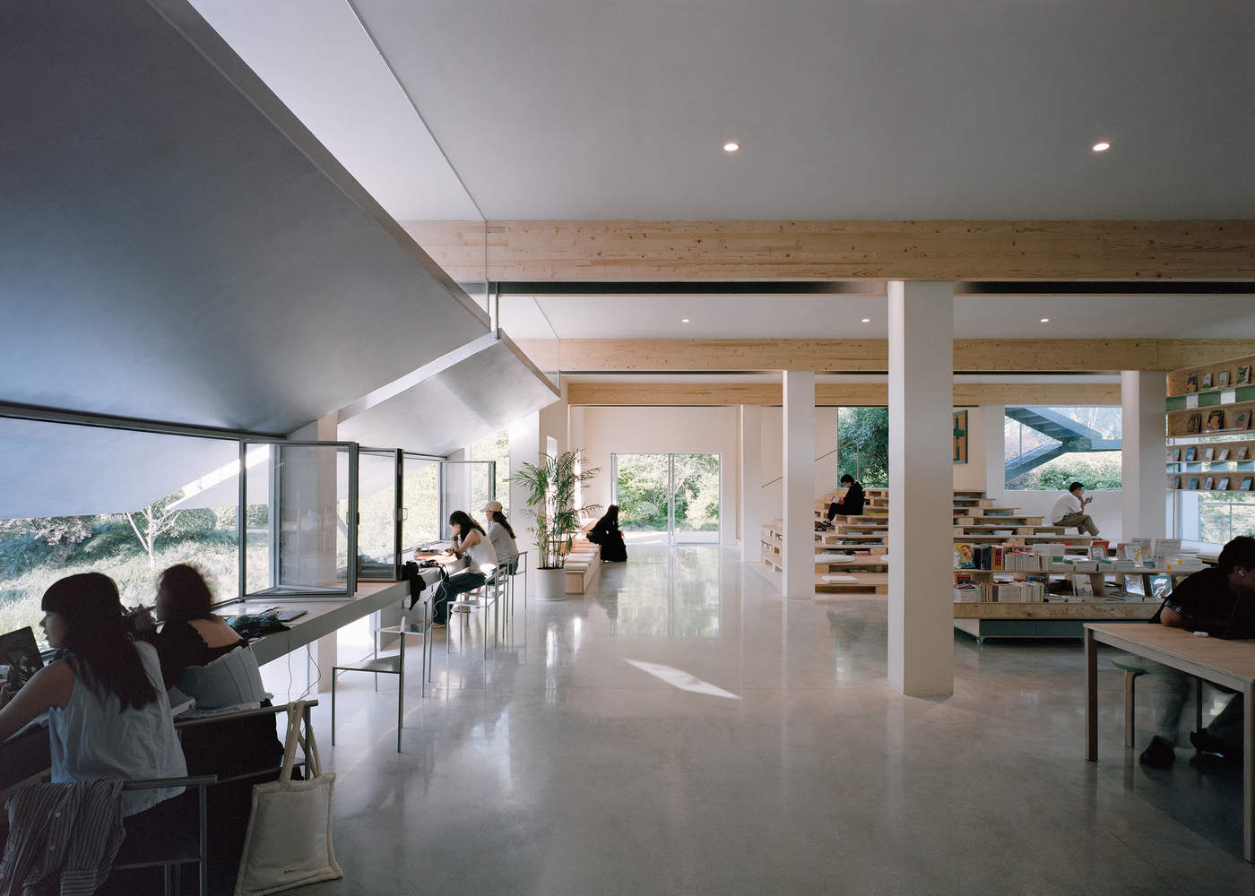 A "Book Pagoda" has been added to the high volume in the southwest corner.. The two nested circular interlayers form a cross-sectional pattern similar to a theater, with staggered scales providing seating and reading spaces at different elevations. The window facing east introduces the greenery of the wetland in the distance.