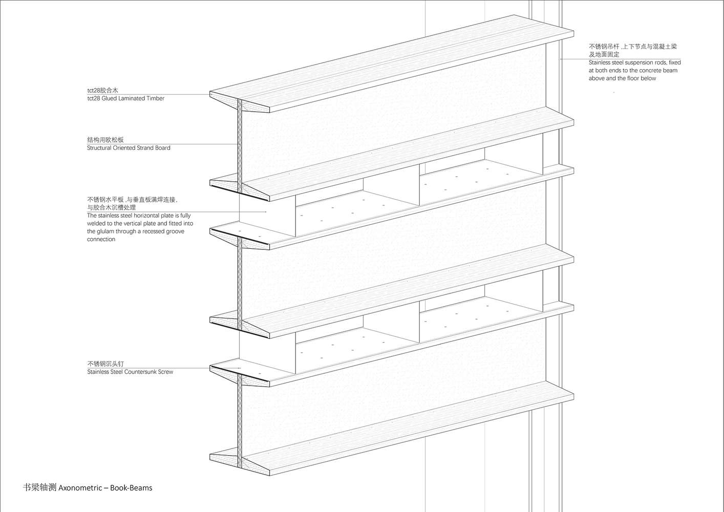 书架被设计为寄生于柱列之间的特定结构要素 —— 通透的“书梁”,希望让读者既能看到书籍、又能看到风景。我们与结构师张准进行合作,创造了 “书梁”结构装置:以横向水平木梁与纵向不锈钢板进行水平层叠,成为组合结构:胶合木和欧松板组合成工字型截面,承担长达 6 米的结构跨度,而纵向不锈钢板则将木梁联结为结构整体,实现平面内的抗扭。书梁由两侧的结构吊杆悬吊而与柱子固定,实现“梁”型的受力模式。