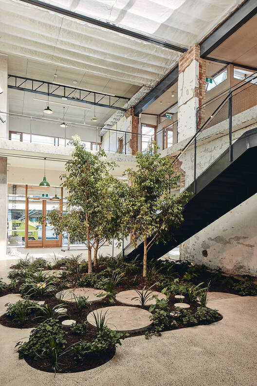 The newly built courtyard is the key to creating a healthy environment, promoting social interaction among colleagues, and establishing connections with the surrounding community. There is a new garden in the central inner courtyard, which grows upwards from the hollow cut from the top plate of the first floor. The ground cover and plants in the central area are carefully selected for indoor environments without air conditioning. The external corner courtyard creates a diverse atmosphere and microclimate, including an edible kitchen garden.