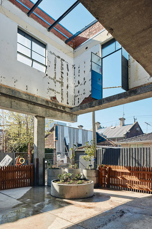 庭院以及连接各楼层、开放与封闭空间的新空间与动线逻辑,都是通过对现有结构进行切割开口而实现的。施工方使用大型圆孔锯在现有混凝土一楼地面上开凿,以露出自然地面,并在庭院中打造出深度种植区,同时在一楼顶板上切割出大型空洞,以形成双层挑高的庭院空间。新的天窗将光线引入建筑深处。