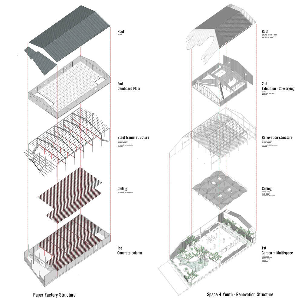 节能环保的细节考量:除了功能性,Space4Youth项目还注重节能环保的设计细节。屋顶桁架结构的改造体现了建筑师对保温隔热的重视。通过增加多层隔热隔音材料、采用聚氨酯屋顶系统和设置空气缓冲层,显著降低了热量传导,从而减少了空调能耗。 此外,建筑师还通过在建筑与街道之间设置缓冲带、融入绿植与水景,营造了宜人的环境。抬高室内地坪、设置景观湖等措施,既满足了消防安全要求,又提升了建筑的整体景观效果。这些细节共同体现了建筑师对可持续设计理念的深入理解和实践,使得项目在满足功能需求的同时,也实现了环境效益和经济效益的统一。