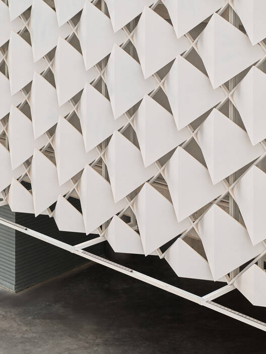 The exterior of the building cleverly balances the rugged industrial style with the delicate and refined texture. The geometric shape of the white aluminum plate skin, shaped by algorithmic logic, wraps around the building in a layered pattern, with alternating presentation of the solid and transparent parts. This dynamic facade design cleverly conceals the irregular functional layout inside, while subtly showcasing the vitality of the building's interior, achieving a perfect balance between privacy protection, shading, and ventilation.
