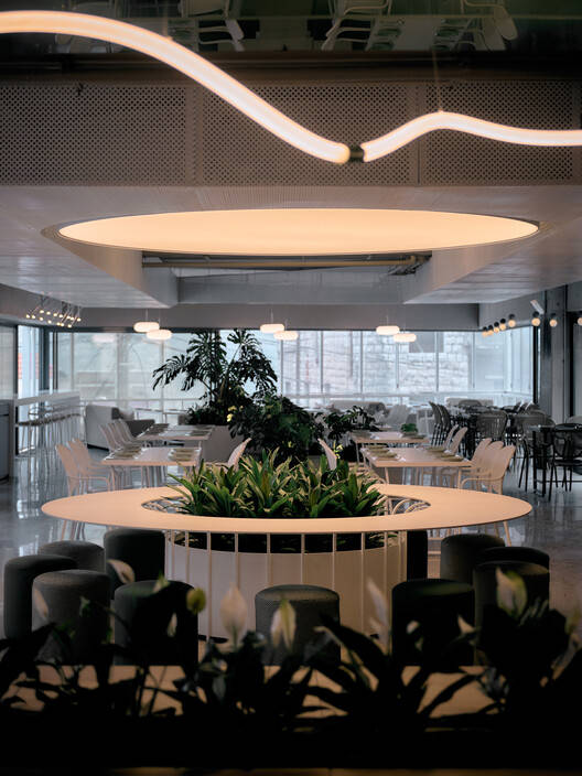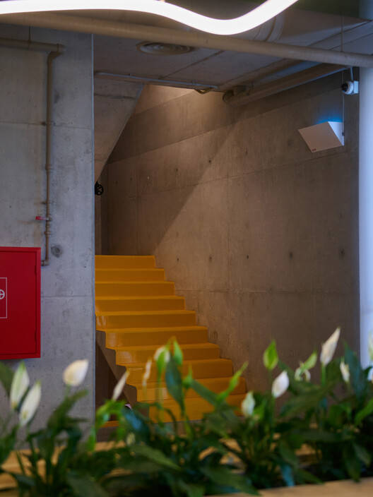 材料运用凸显对比张力:裸露的混凝土与机械系统,与光洁的白色金属外墙形成鲜明对峙,演绎出粗犷实用与精致雕琢之间的对话。这种矛盾感奠定了建筑双重特质 —— 既扎根现实,又充满进取精神。