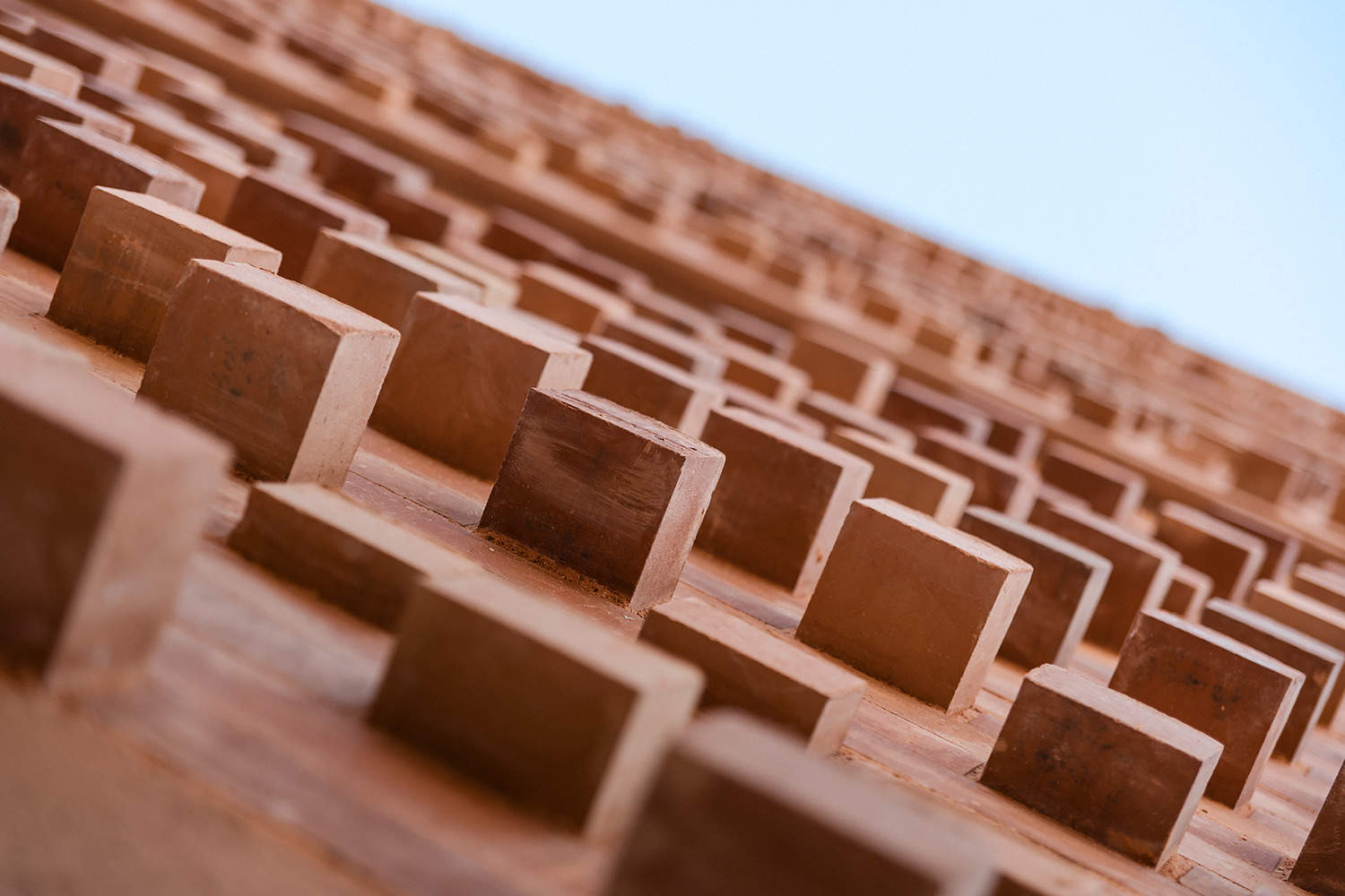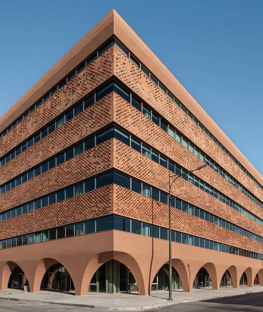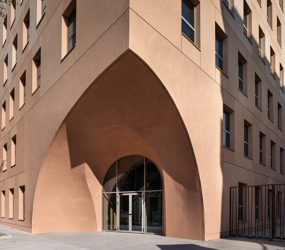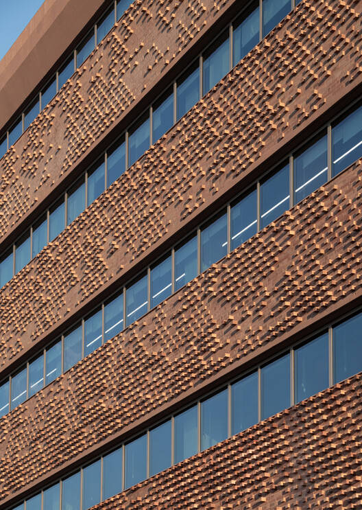 The facade is made of custom designed ceramic tiles arranged in a three-dimensional pattern, using five shades of red pottery. The gradient effect of transitioning from darker tones at the bottom to lighter tones at the top creates the illusion of the building blending into the mist. The project was developed using BIM technology and underwent extensive digital analysis to optimize facade implementation. Professional research in collaboration with S. A Anselmo has created customized ceramic tiles that strike a balance between aesthetic appeal and technical precision. Visited the manufacturer's factory in Italy, conducted practical evaluations, and ensured long-term durability through meticulous color and texture improvements.