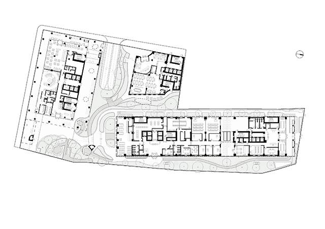 空间布局与功能体验的和谐统一:在空间布局方面,HUB26项目也展现了其设计精髓。三栋建筑的布局策略性地朝向主街,最大化了海景视野,从而在城市中树立了醒目的商业形象。建筑内部,每栋楼都直接通向中央广场,形成了开放、流畅的互动空间,促进了不同功能区域之间的联系。此外,项目还注重营造宜人的户外环境,阶梯花园为人们提供了放松身心的场所。这种以人为本的设计理念,结合对自然采光和通风的优化,营造出舒适、高效的工作环境,体现了对未来办公模式的深刻思考和积极探索。