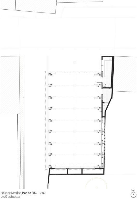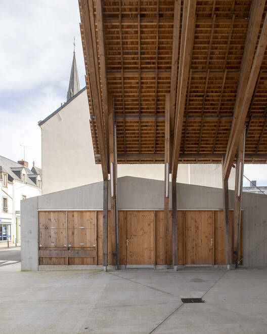 在最近腾空的一处中空空间里,新建的市场大厅重新编织起城市的肌理。它提供了一个宁静的休憩空间,与教堂广场遥相呼应。市场大厅将两处边界向内退让,从而在面对主街的一侧打造出一片前庭广场,并开辟出一条小巷,将其与街区不断变化的核心区域相连。通过加厚剩余的两处边界,市场大厅形成了封闭的服务空间。大厅坐落于一处缓坡之上,展现出一种既显著又不显突兀、历久弥新的风貌:它宛如城市中的一处静谧之所,开放、充满活力且热情好客。