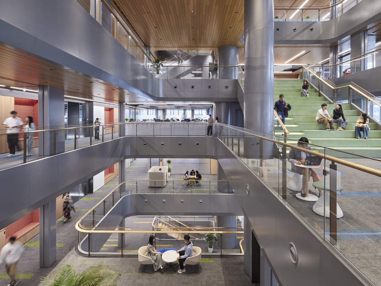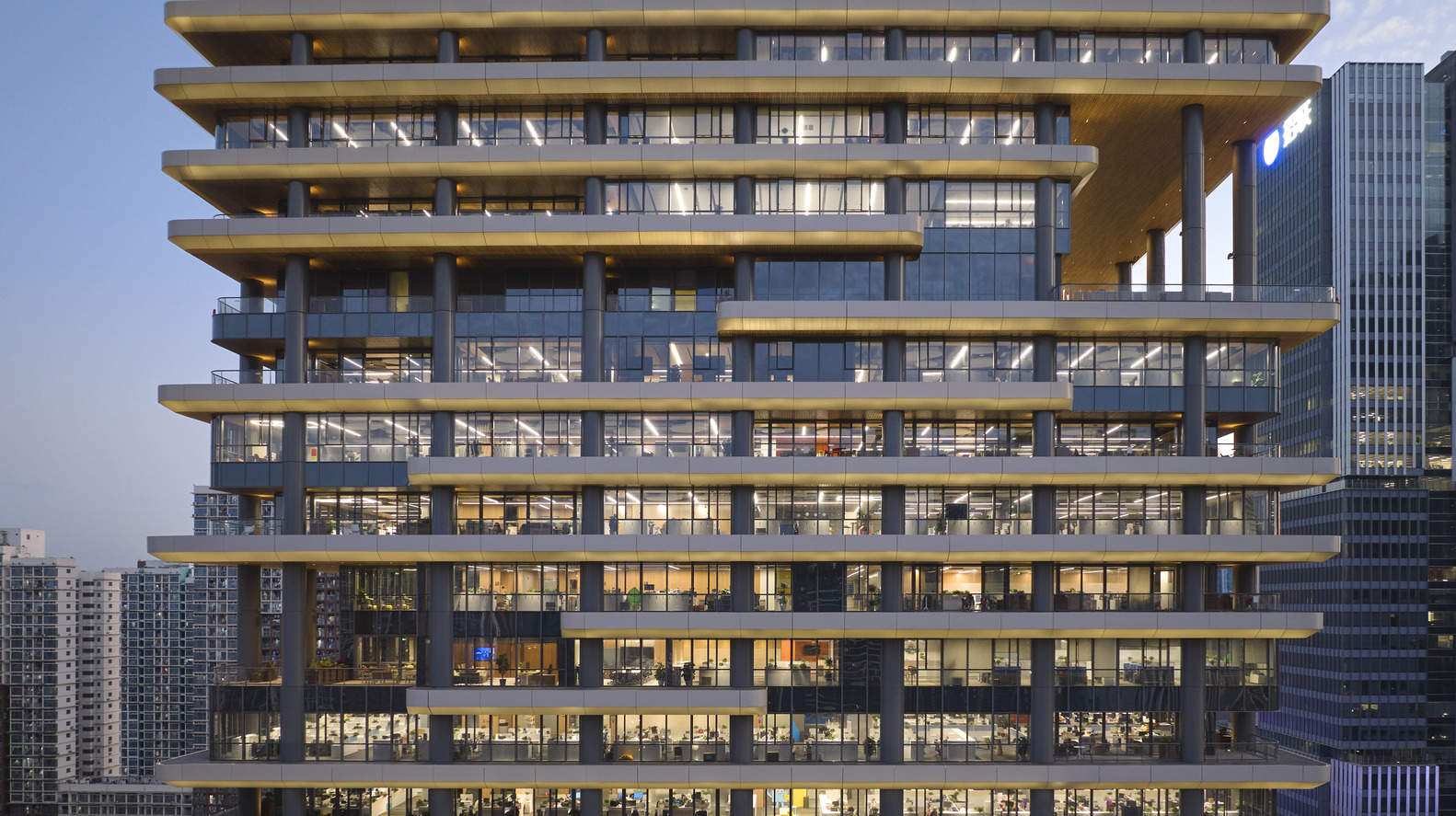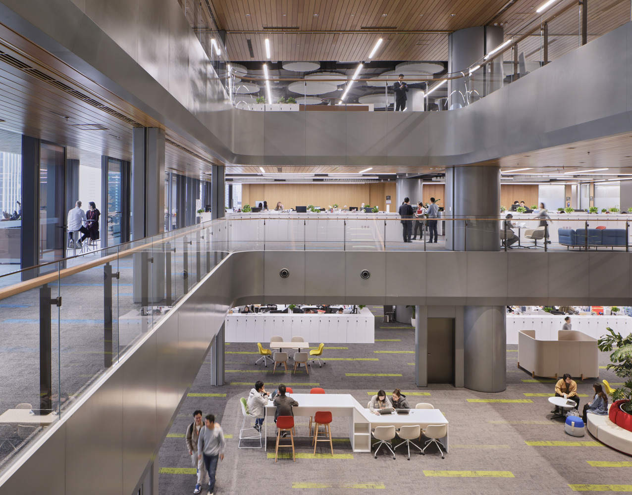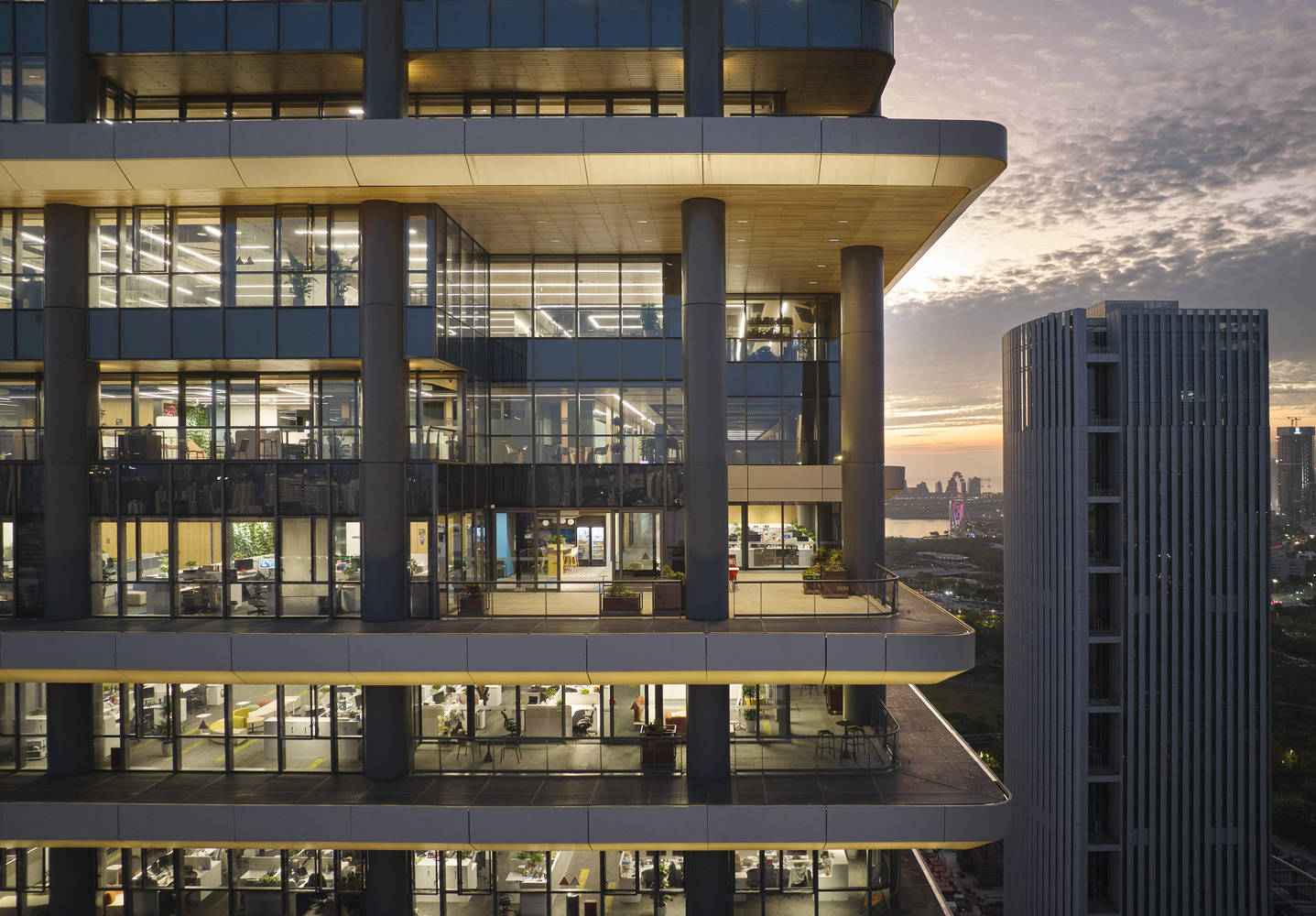 微众银行总部项目开创了办公空间设计新范式——将基于自然的设计策略与前沿科技相结合,打造健康、高效的办公环境。“建筑也体现了微众银行的使命,通过公共露台、共享中庭和智能办公空间,促进员工之间的联结。” —— SOM 合伙人 Scott Duncan 说道。
