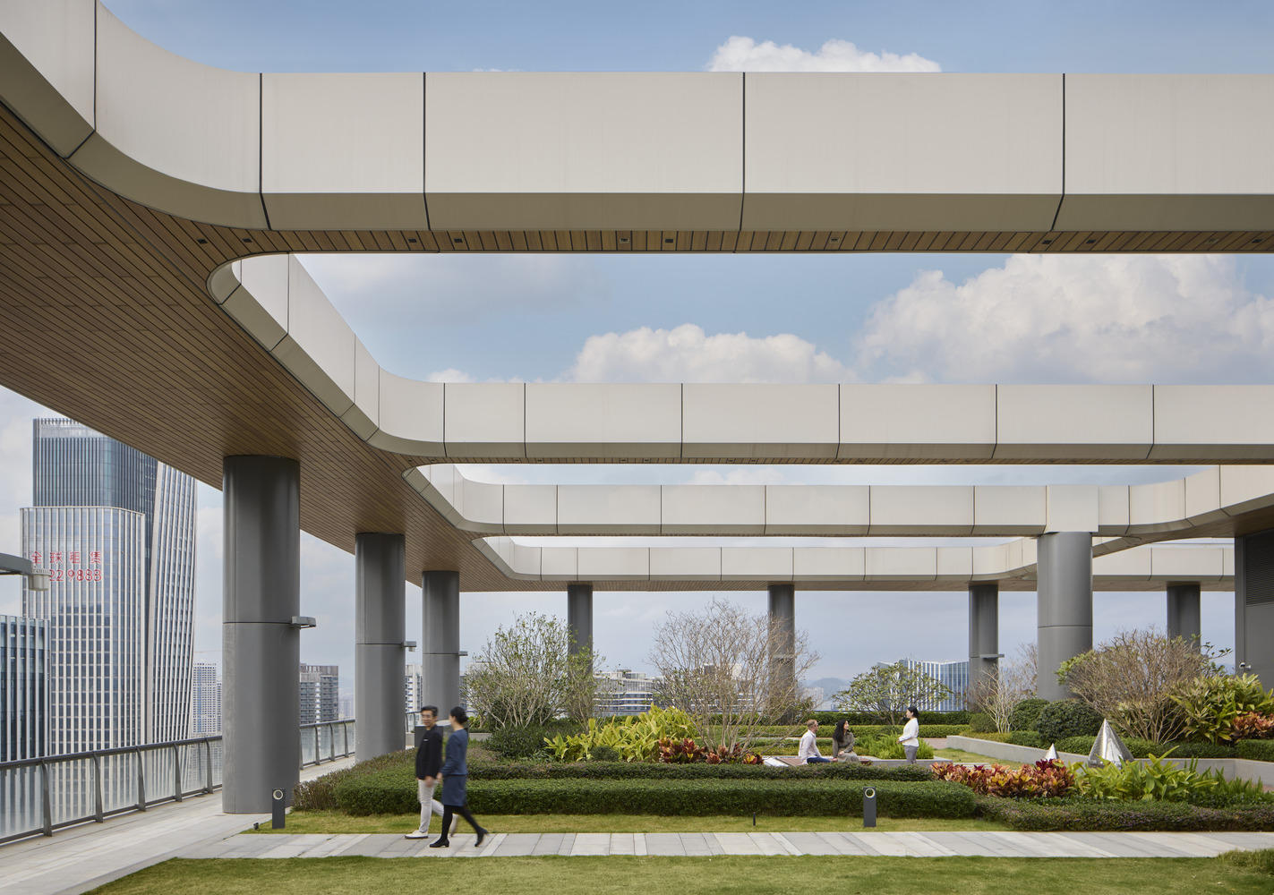 塔楼顶部的景观花园,为员工打造了一处休憩空间。花园内置雨水收集系统,用于循环灌溉,并有效管理雨水径流。此外,屋顶预留太阳能设备安装条件,积极响应微众银行长期践行的可持续发展目标。
