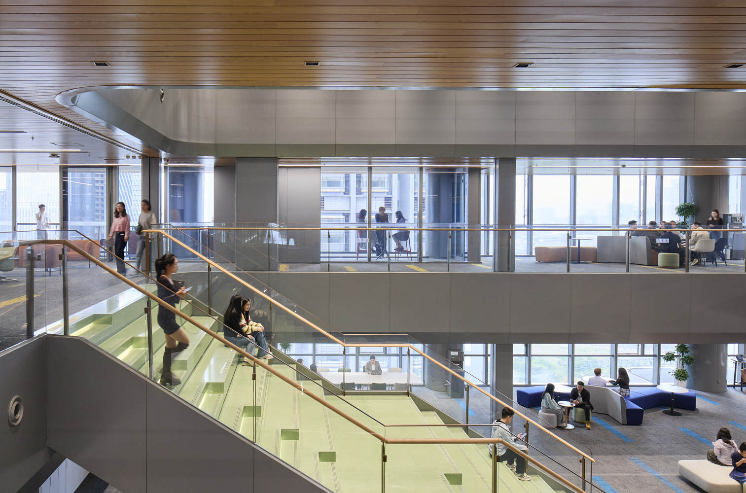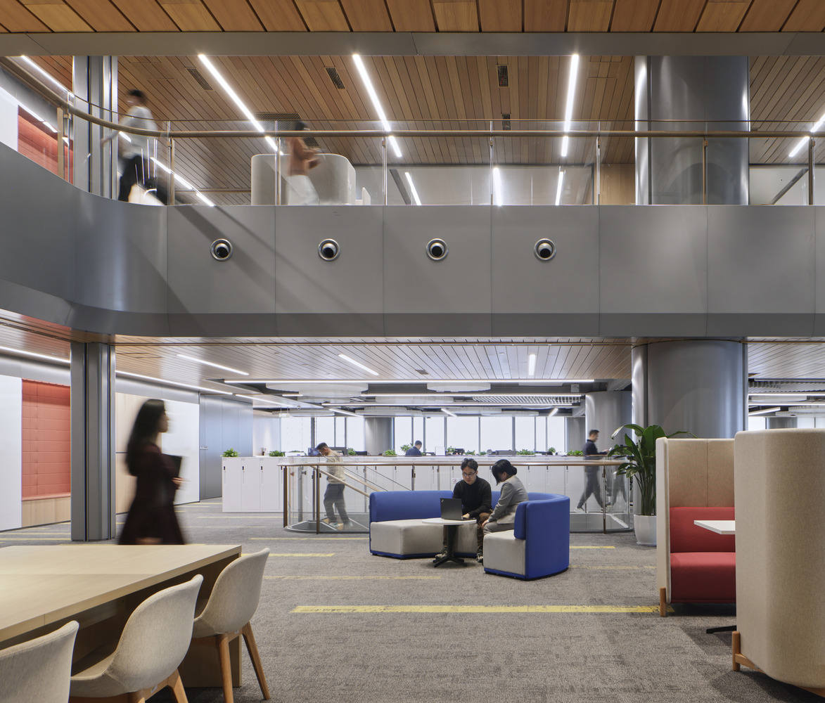 The tower's design is highly expressive - with staggered floors and double layered ceilings - creating a porous facade that breathes, promoting air circulation and natural lighting. The internal space adopts a spacious and transparent open office layout, aiming to create a comfortable and collaborative atmosphere. Employees can step into the outdoor terrace at any time and get close to nature. The open floor with an area of more than 4000 square meters provides the possibility of flexible team configuration to meet the business needs of rapid iteration of financial technology and Internet enterprises. A multi story indoor atrium connects different departments. In addition, a range of leisure and health facilities - including basketball courts, gyms, outdoor swimming pools, staff restaurants, and multipurpose halls - create a sense of work life balance and community atmosphere.