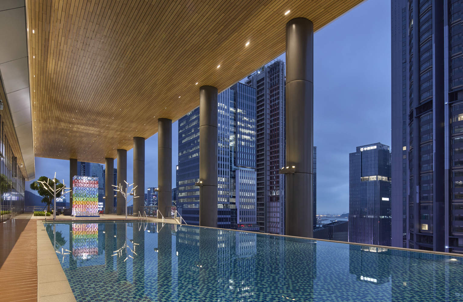 SOM 的设计植根于健康理念与可持续发展策略。塔楼已获得 LEED 铂金级认证,中国绿色建筑标志三星级认证也在进行中。针对深圳的亚热带气候特征,设计整合了一系列被动式与主动式环境优化策略:太阳能响应式立面既过滤眩光,又可大幅降低热量吸收;悬挑和内凹式阳台将太阳辐射减少 50% 以上,从而降低制冷需求,让室内四季保持宜人温度。与此同时,建筑的自动化系统可以调控各项功能,从而以最少的机械设施,维持最佳室内环境。