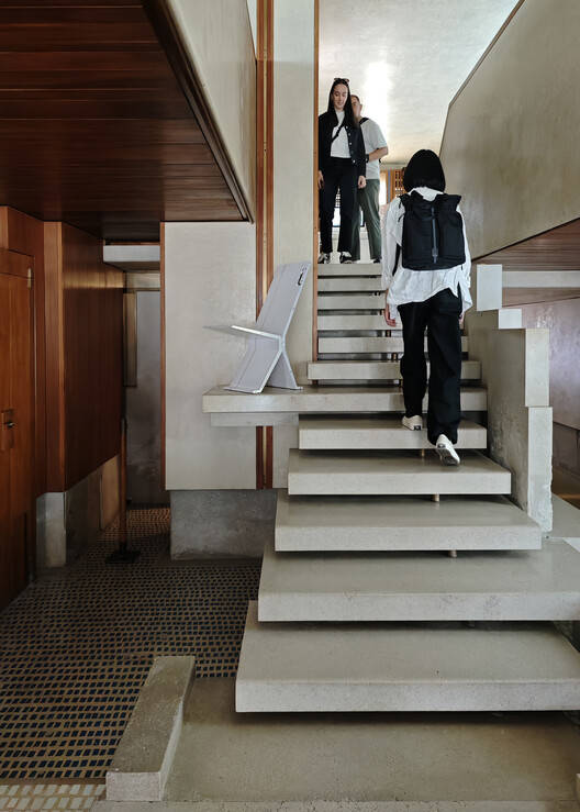 在现有建筑结构的限制条件下开展工作,斯卡帕引入了一系列精妙的空间改造手法。他增设了新的窗户,并打通室内空间以引入自然光,营造出一种微妙而富有戏剧性且精准的氛围。在保留建筑历史风貌的同时,他彻底改变了空间体验 —— 其中最显著的是通过标志性的楼梯设计,以及将上层空间重新规划为悬空的走道和阳台。这些悬浮的元素保持了平面布局的开阔感,并为原本昏暗的空间注入了一种轻盈与灵动之感。