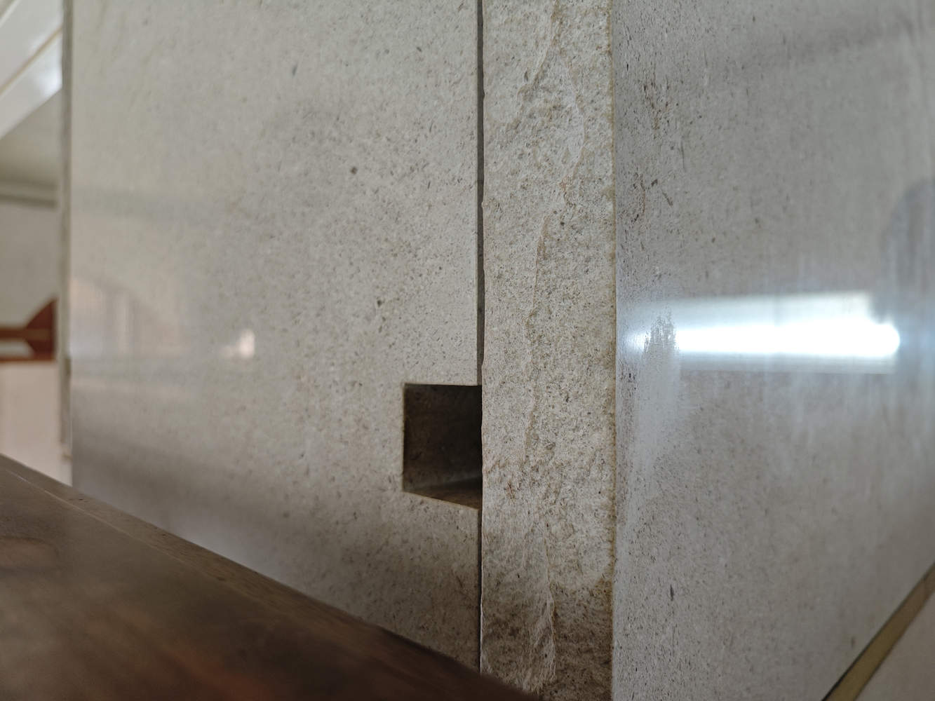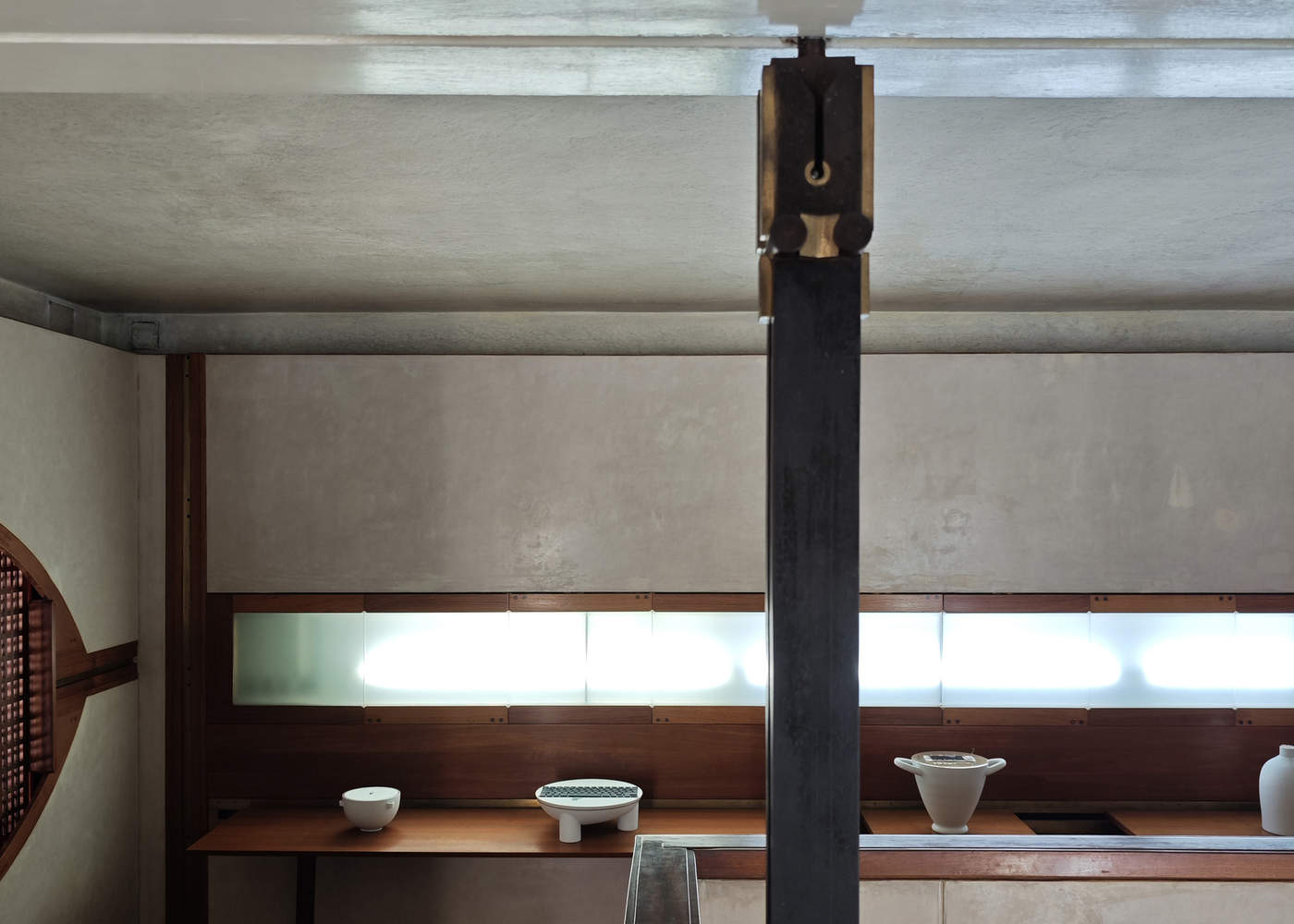 斯卡帕(Scarpa)在材料运用上的精准度在中央立柱上体现得尤为明显。乍一看,这根垂直立柱仿佛嵌入了一根横梁之中,令人联想到传统木工技艺的优雅。然而,仔细端详便会发现,这种连接其实是一种巧妙的视觉错觉:立柱实为中空,形成了一个垂直的空隙,将立柱与看似由它支撑的横梁分隔开来。所谓的榫口并非结构细节,而是一种雕塑般的表面处理 —— 它只是一种视觉上的暗示,而非承重关节。这种误导性的设计主题在立柱的转角处得以延续,斯卡帕摒弃了棱角分明的斜接,转而采用搭接缝。但即便如此,这种搭接也并非机械般规整或干净利落 —— 它故意呈现出粗糙与不规则的质感,是对切割与边缘的触觉表达。斯卡帕并未刻意隐藏材料接缝,反而将其凸显出来,在精致与粗犷之间营造出一种张力。正是这种结构与错觉、精准与不完美之间的相互作用,定义了展厅的空间语言。