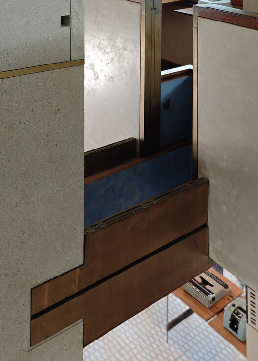 黄铜与金属细节的运用不仅局限于楼梯,在展厅的各个角落都可见其身影,如门五金件、橱柜拉手、扶手、柱缝以及悬挂构件等。这些点缀元素常常标记着空间的过渡时刻。在微观尺度上,它们在材料之间起到桥梁作用 —— 调和对比,柔化接缝。在宏观尺度上,它们则定义了空间的转换。例如,支撑高架走道的每一根拉杆顶端都装有一个抛光的青铜套头,强化了视觉上的悬浮感。这些闪亮的点与黄铜楼梯支架相互呼应,共同构成了一个璀璨的连接星群 —— 每一个细节都无声地彰显着斯卡帕对细节表现力的坚定信念。