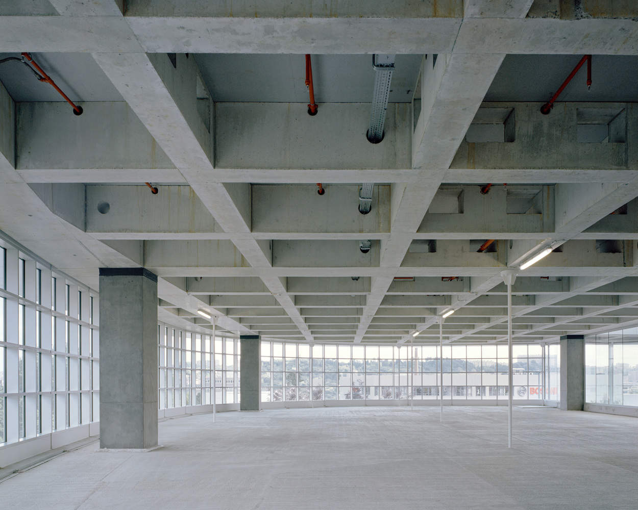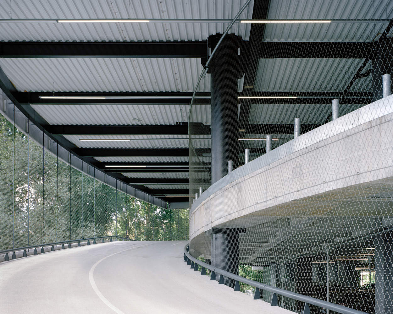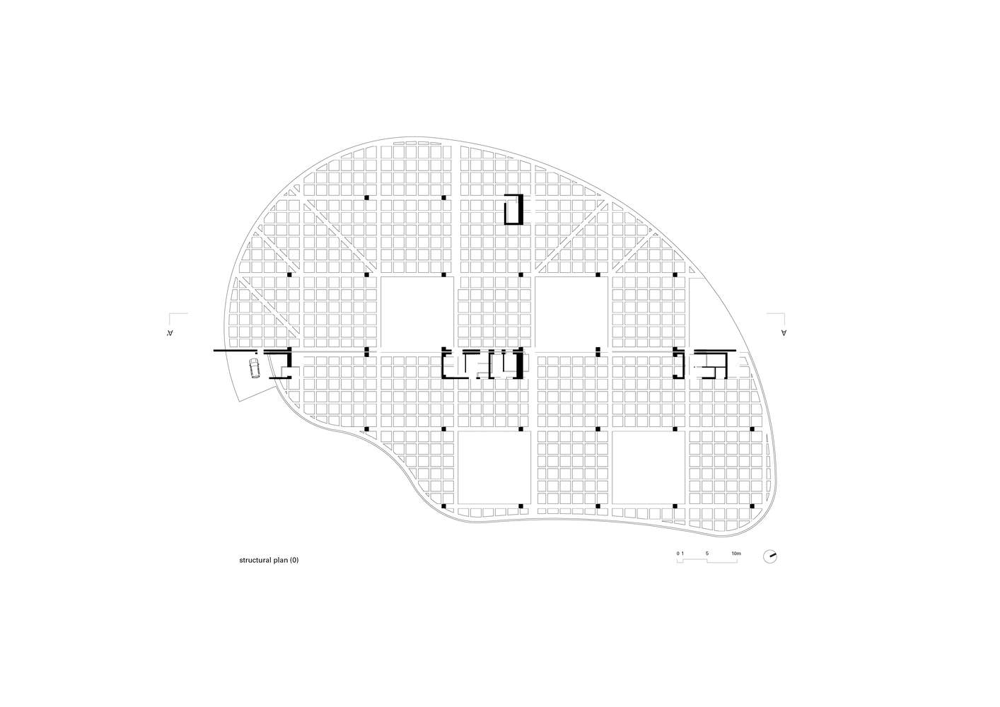 建筑内部采用合理的、高承重混凝土结构,楼板跨度达 16.2 米,高度为 7 米,如有需要,还可增设中间钢制楼层。而建筑外部,结构的稳固性则通过曲线形的透明立面(东南侧为玻璃材质,西北侧采用钢缆与网状结构)得以平衡,这些立面的设计灵感源自现场汽车与卡车的行驶动态、主干道的弯曲走向以及地块无定形的边界轮廓。最终,一系列庭院与中庭贯穿了这个大型建筑体量,为外部缺乏的空间与宁静提供了补充。