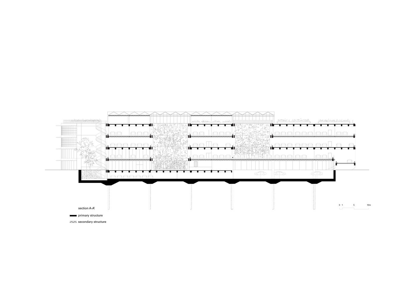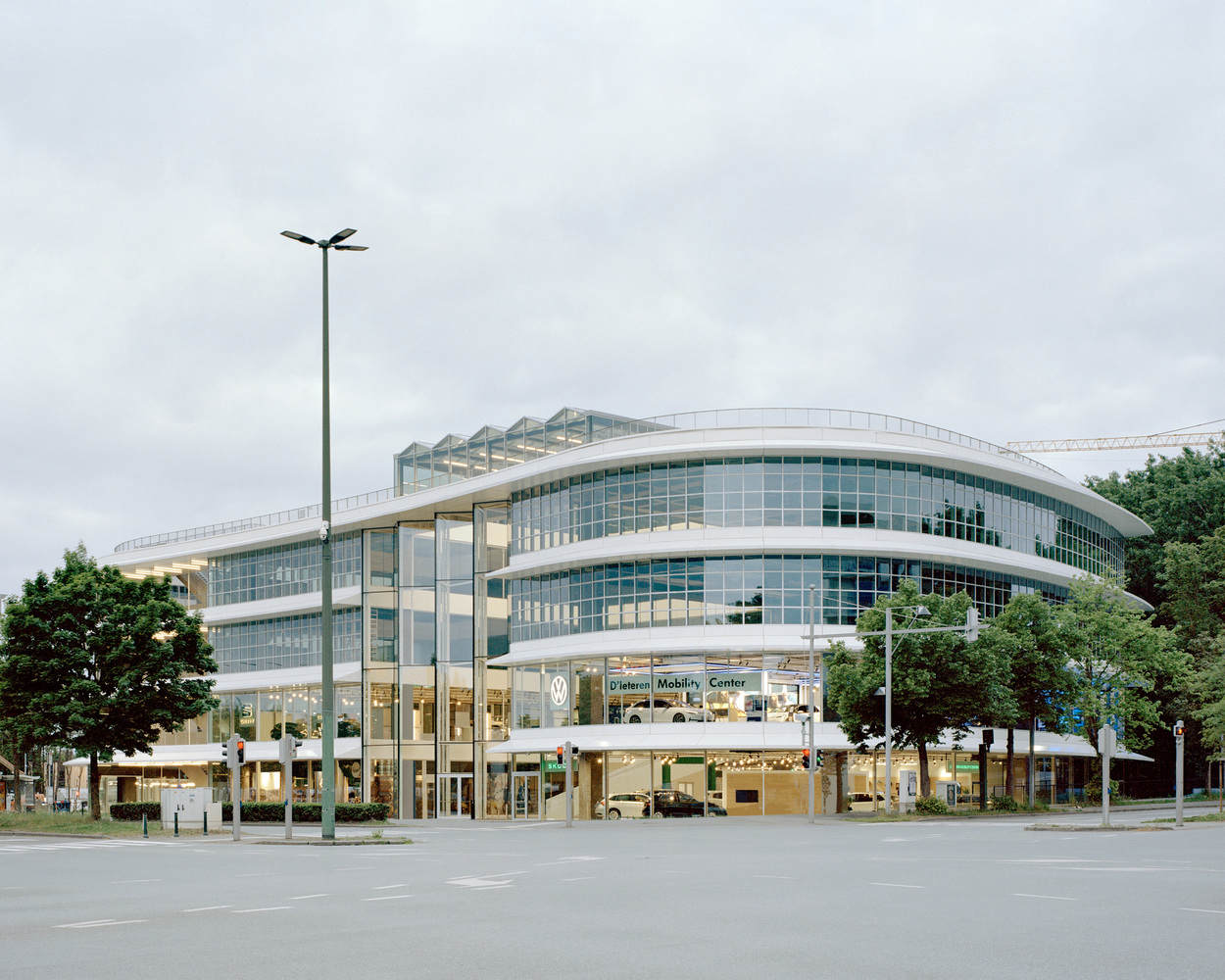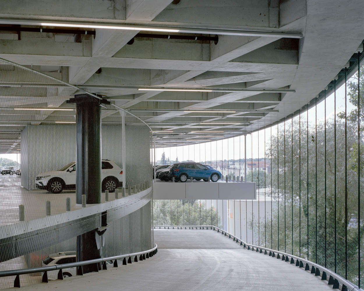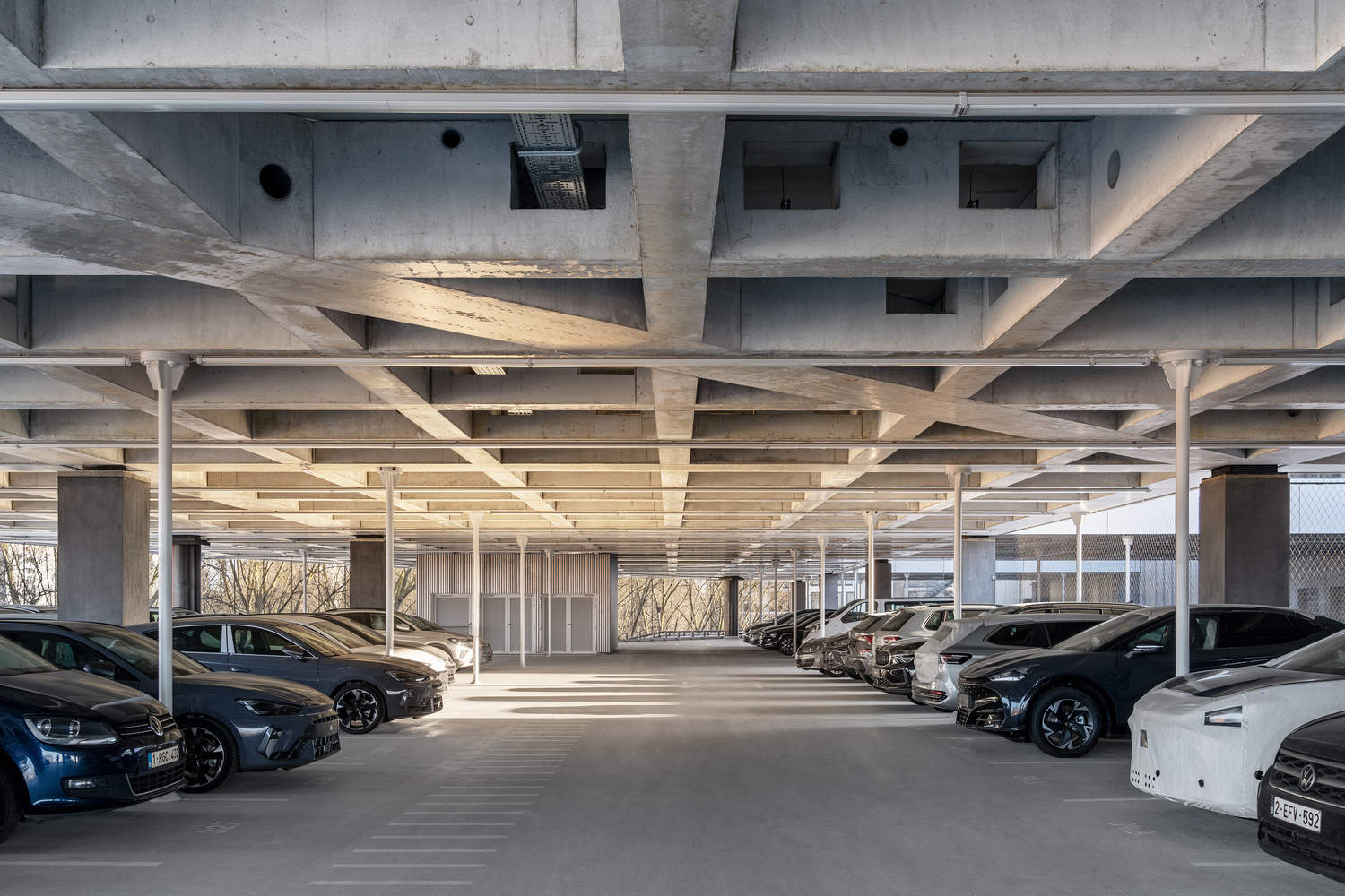 建筑内部采用合理的、高承重混凝土结构,楼板跨度达 16.2 米,高度为 7 米,如有需要,还可增设中间钢制楼层。而建筑外部,结构的稳固性则通过曲线形的透明立面(东南侧为玻璃材质,西北侧采用钢缆与网状结构)得以平衡,这些立面的设计灵感源自现场汽车与卡车的行驶动态、主干道的弯曲走向以及地块无定形的边界轮廓。最终,一系列庭院与中庭贯穿了这个大型建筑体量,为外部缺乏的空间与宁静提供了补充。