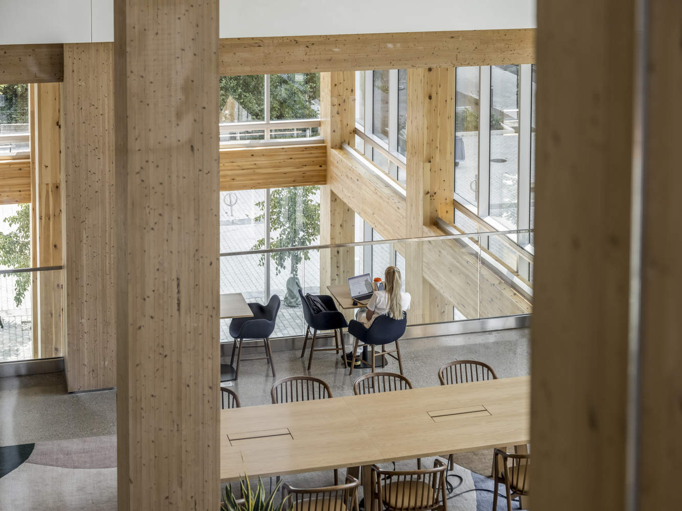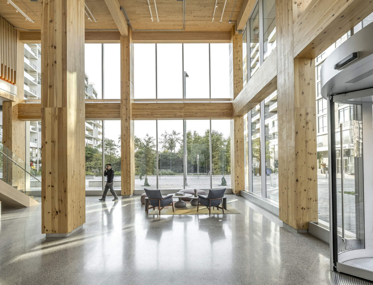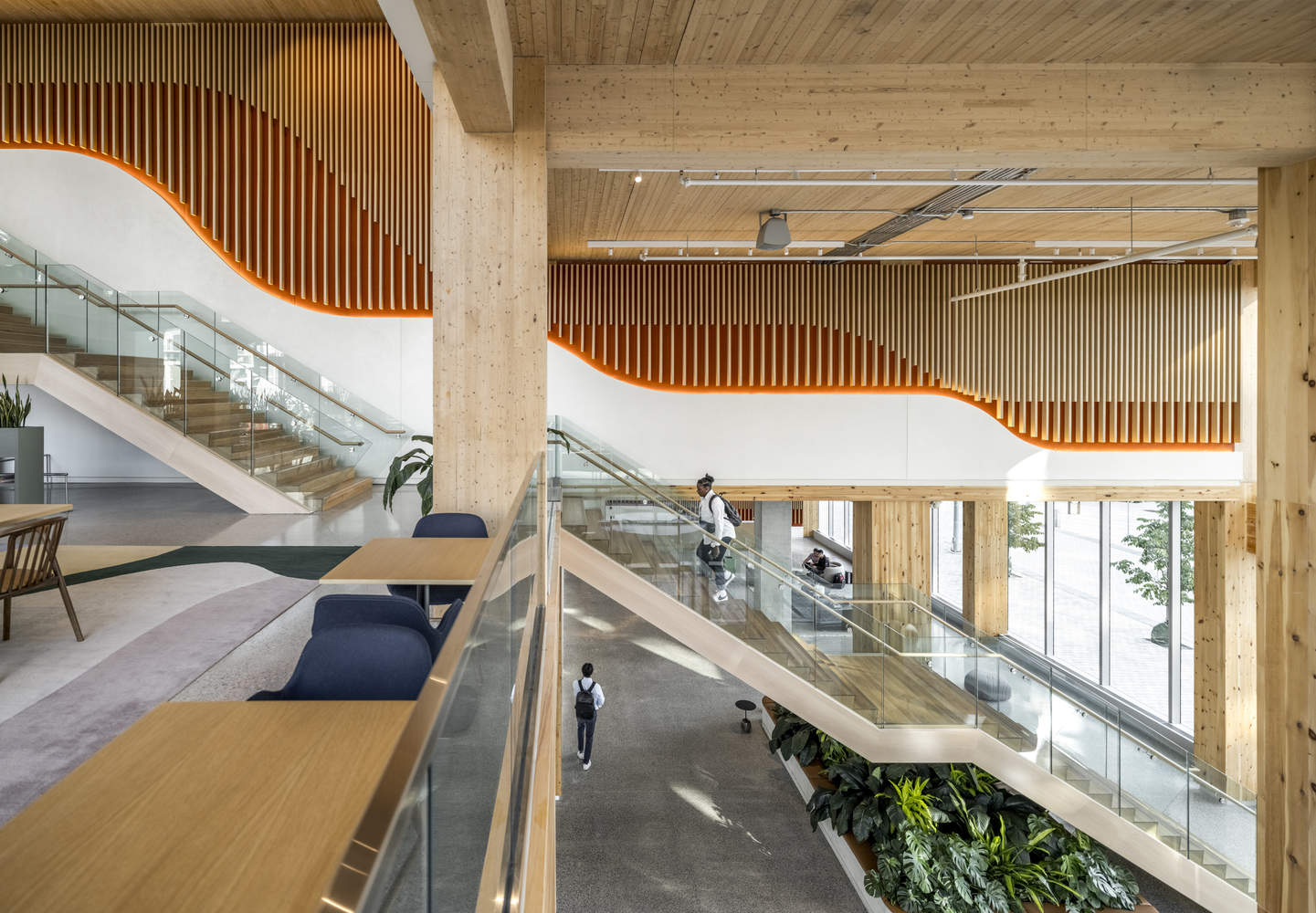 以人为本的室内空间设计:该项目在设计中高度关注租户的福祉,并力求获得WELL认证,这突显了对室内环境质量的重视。内部完全暴露的木结构,不仅展现了建筑的结构美学,更营造了温馨、自然的室内氛围,对提升员工的健康和工作效率大有裨益。建筑师匠心独运地设计了阶梯式的内部空间序列,将公共空间延伸至建筑内部,创造了开放、灵活的“城市客厅”,这种设计模糊了公共与私有空间的界限,鼓励互动与交流。这种设计理念体现了对使用者体验的关注,以及对创造积极、健康工作环境的追求。
