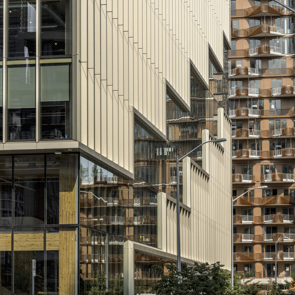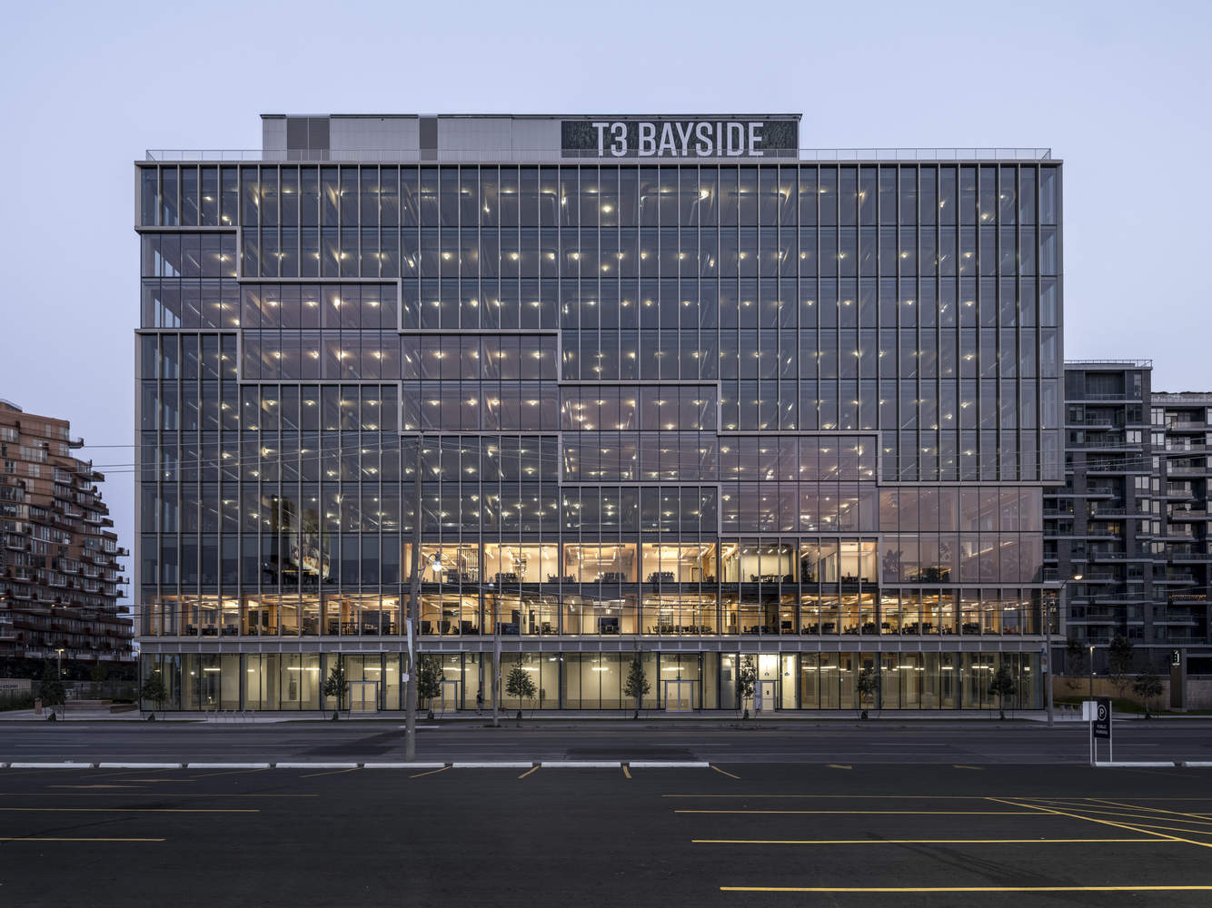 From the architect. T3 Bayside is a groundbreaking wooden office building located in Bayside, an emerging mixed use community in Toronto, situated on the shores of Lake Ontario. The building stands at a height of 42 meters and is the tallest wooden office building in North America.