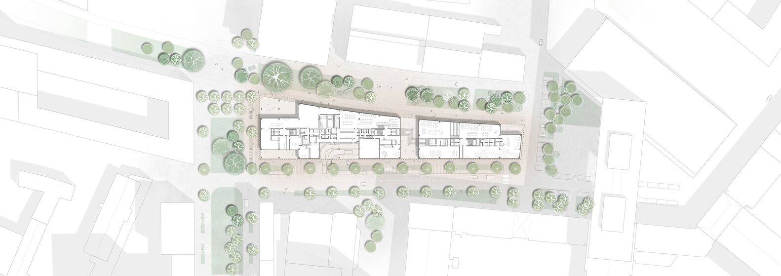 建筑上部由四层办公空间组成,采用 Z 字形布局,开放灵活的办公场景围绕多个不同高度的外部绿色庭院展开。内部则通过三大核心筒连接各办公楼层,并延伸至建筑基座。