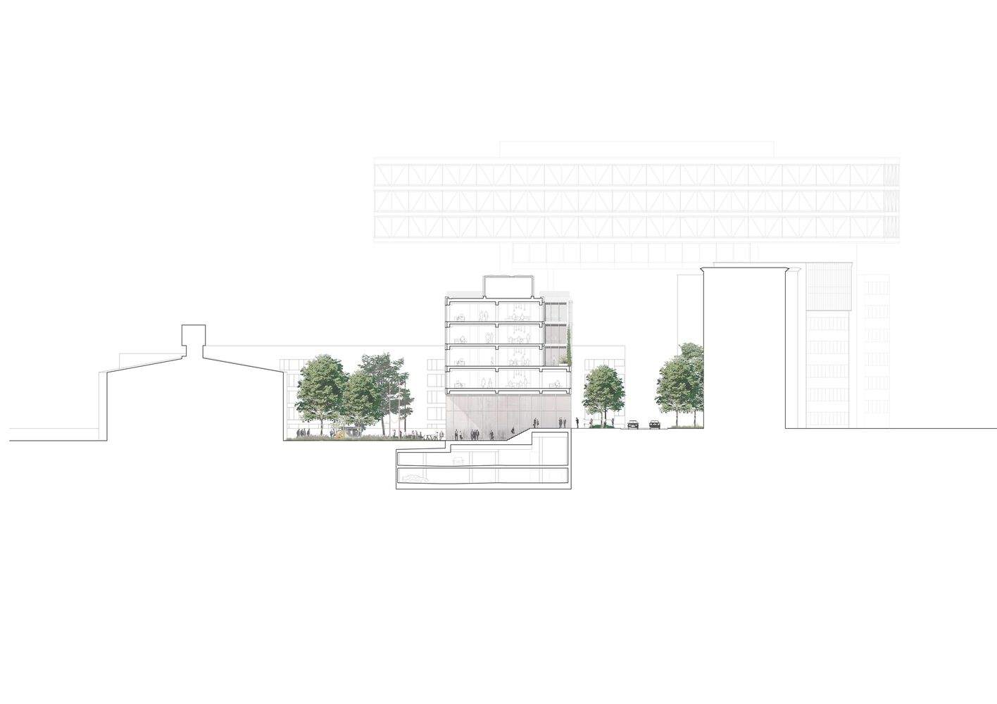 The upper part of the building consists of four levels of office space, arranged in a zigzag pattern, with an open and flexible office environment revolving around multiple external green courtyards of different heights. Internally, three core tubes connect each office floor and extend to the building base.