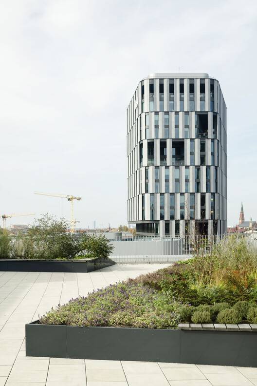 庭院有助于将自然光引入建筑的大面积楼层,并最大化整栋建筑的微气候特性,同时积极有助于显著减少热岛效应。整体建筑网格由预制构件组成,无论是在内部还是外立面上,既减少了建筑时间和施工成本,又通过类似浮雕的立面结构为大型窗户部分增加了被动遮阳。可持续材料,如再生混凝土和铝材,已在建筑中得到应用。