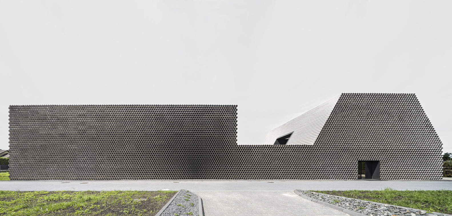 来自建筑师。Gambit 是一家专业管道分销公司,委托设计团队设计一座办公仓库大楼,作为其独特的展示空间。设计团队被要求以尽可能低的成本做到这一点,为此设计团队想出了使用他们日常交易的材料作为建筑主要建造材料的想法,这个做法使得办公室和仓库部分很好地形成了一个统一的整体。 设计团队将建筑设计成一堆管道的样子,直观传达了公司的业务。
