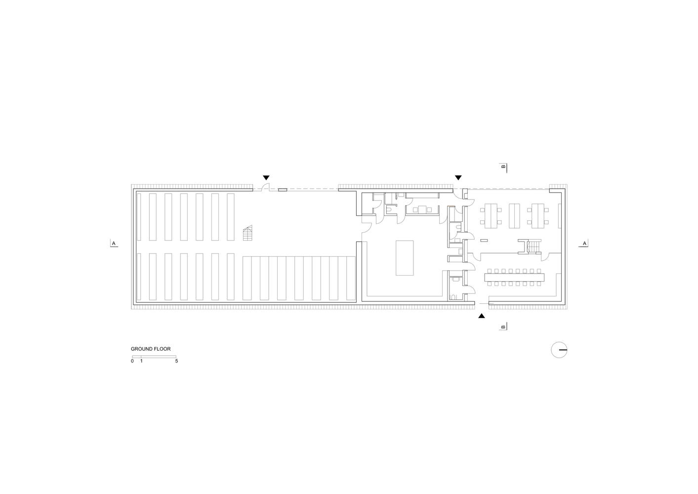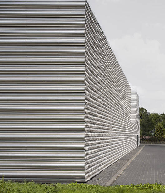 The three main functions of a building - warehouse, order preparation workshop, and office area - are reflected in its form. The lower part is the workshop, and the higher rectangular prism is the unheated warehouse. The layout of the pipeline determines the inclination of the roof. The inclination angle of the pipeline determines the shape of this part of the building, and the office space with a sloping roof has been adjusted on the second floor according to the local building height restrictions.
