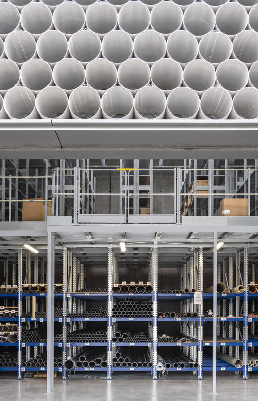 From the architect. Gambit is a professional pipeline distribution company that commissioned a design team to design an office warehouse building as its unique display space. The design team was asked to achieve this at the lowest possible cost, and thus came up with the idea of using the materials they trade daily as the main building materials. This approach effectively integrated the office and warehouse parts into a cohesive whole. The design team designed the building in the shape of a pile of pipes, which intuitively conveyed the company's business.
