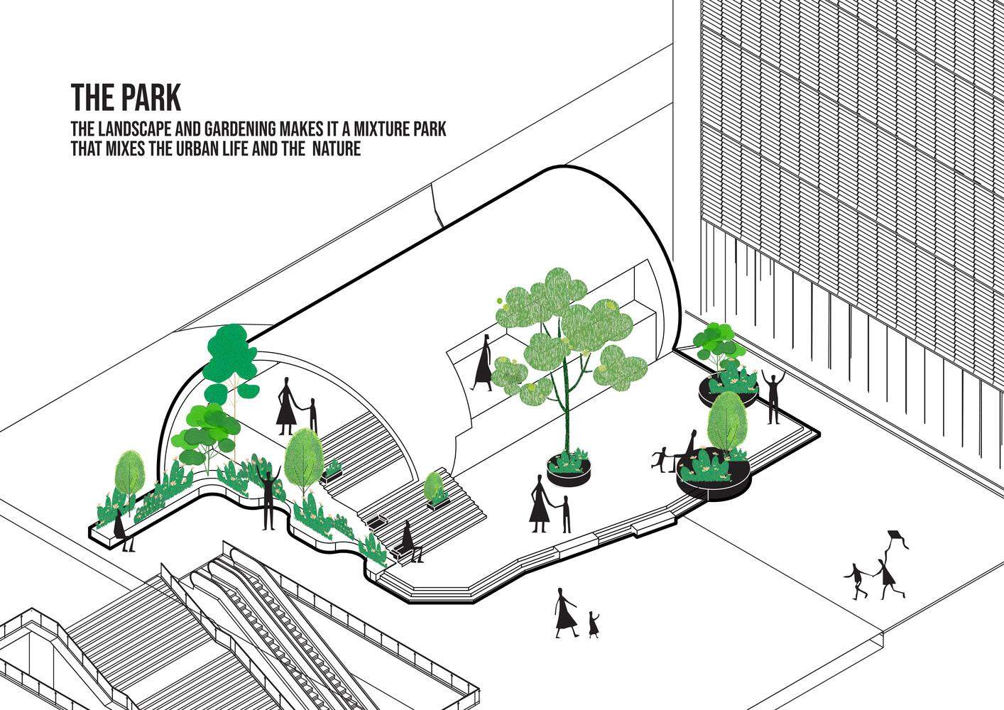 The design team selected a cylindrical volume as the solution through a rigorous "shape finding" process. The selection is based on three considerations: the circular shape has the qualities of rationality and humility; The cylinder can form a visual equivalence with the hugging elephant in the square; Its complete form can have an equal dialogue with surrounding large buildings. The planning scheme of "one arch, two stages, and three stages" has emerged: facing the active line, using Boolean techniques to open up the volume and form an open commercial interface; A stepped composite platform is set up on the side of the Water Square, activating the space through three levels - the first level elastic market area serves as a transitional space, the second level stepped grandstand area creates a ceremonial experience, and the top level aerial stage area creates an "aerial garden".