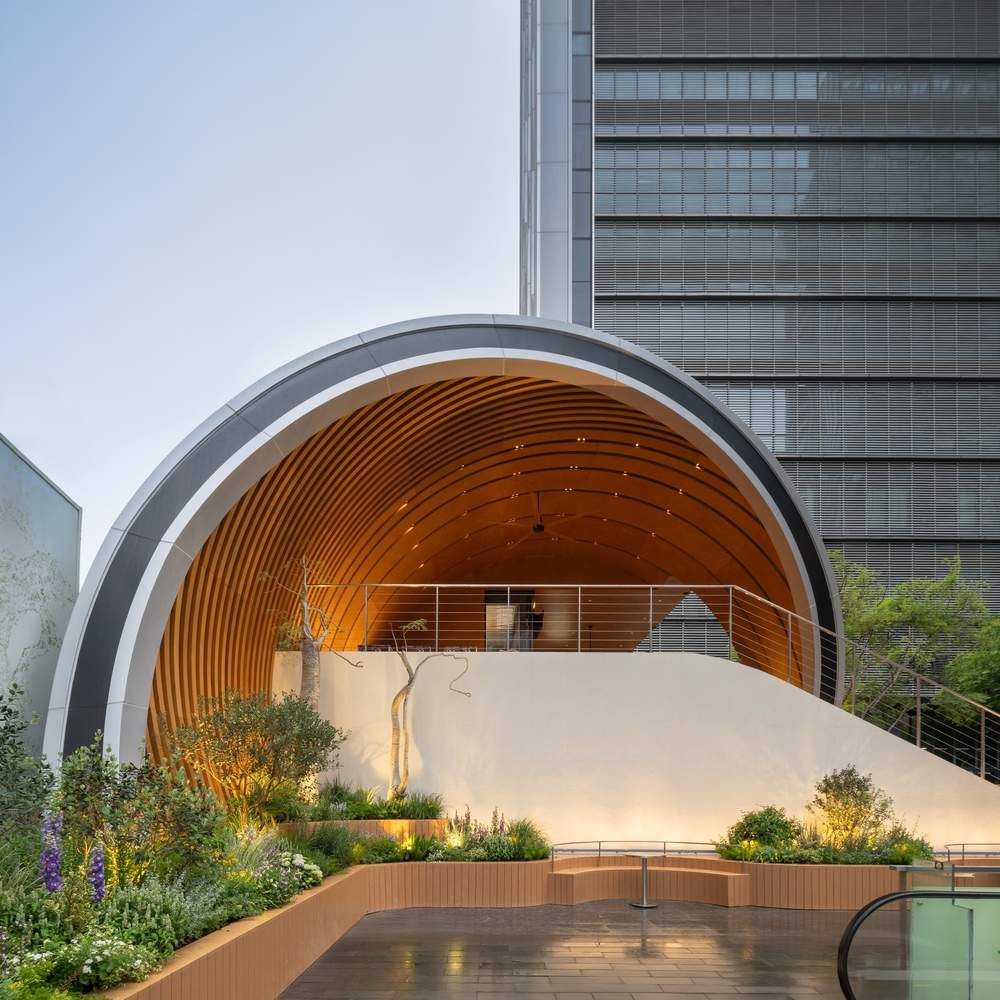建筑以 18 米钢构圆拱为核心,南立面敞开以优化商业展示面。拱形几何切割形成大台阶顶棚,兼顾功能与形式。材质上,银色铝板屋面呼应周边建筑,近人尺度采用木材与木色铝板,营造亲切感。景观设计模糊边界,实现商业与公共空间的自然过渡。
