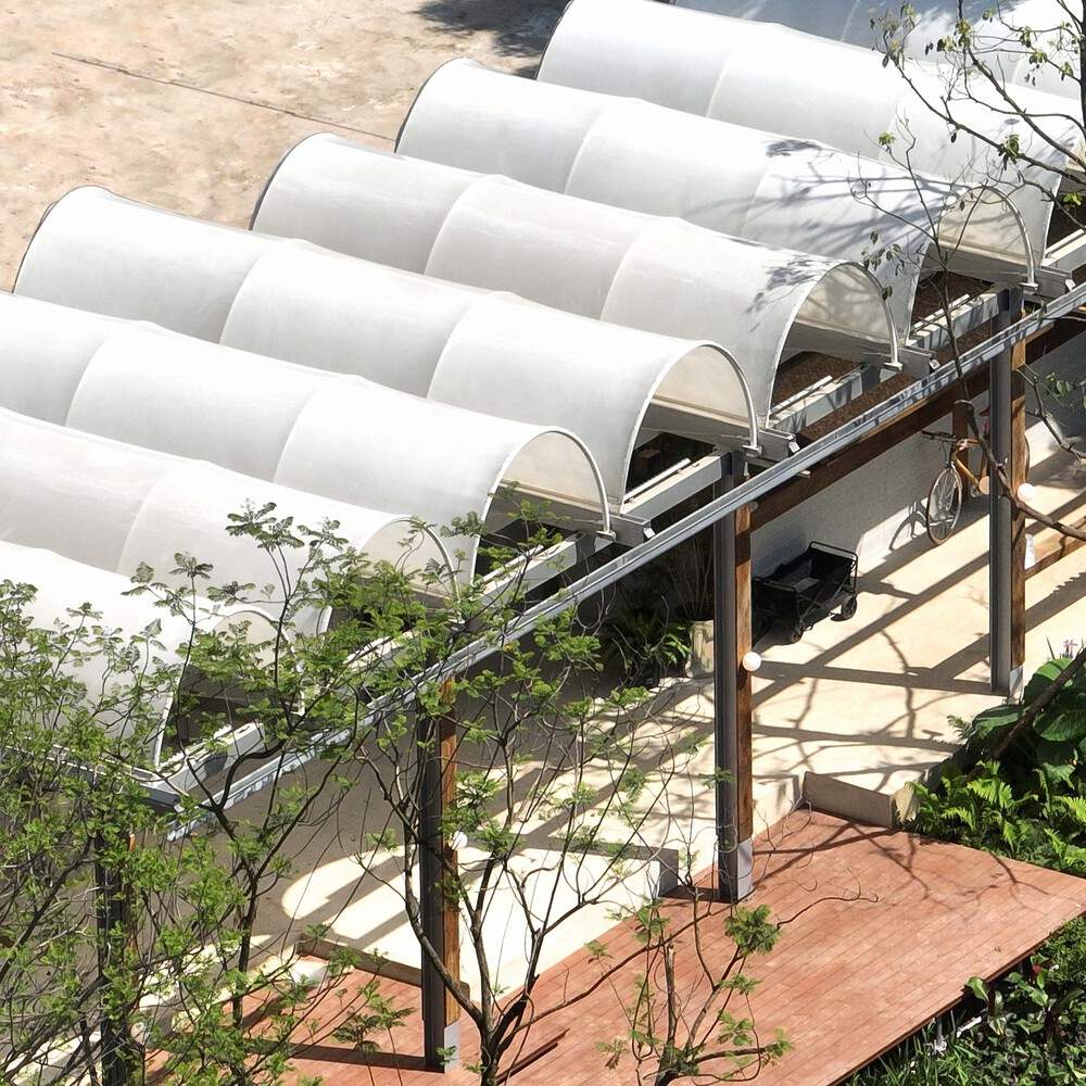 . The thin film material of the dome, like leaves, transmits soft light and shadow in the sunlight, alternating between day and night, creating a poetic and spiritual spatial experience. Clear concrete, exposed steel beams and columns, semi wrapped old wood, and climbing vines and green plants naturally evolve over time and seasons, endowing the building with life and emotion.