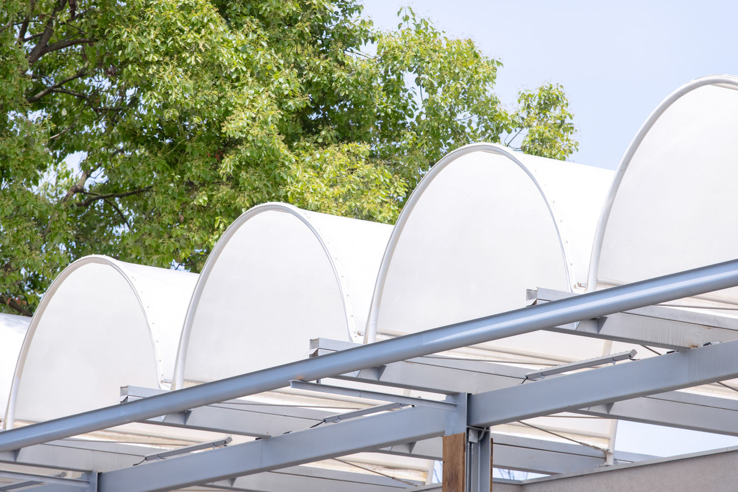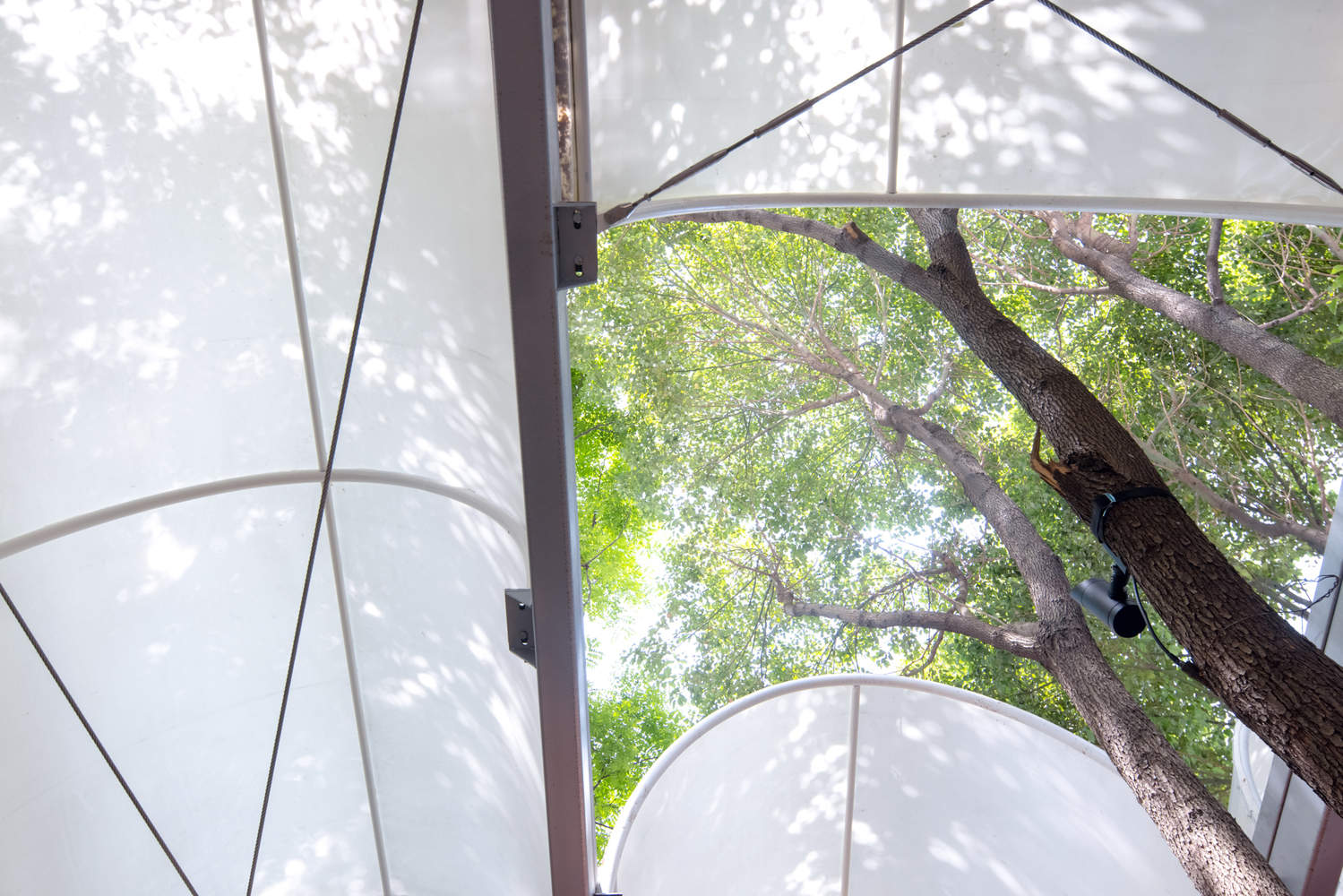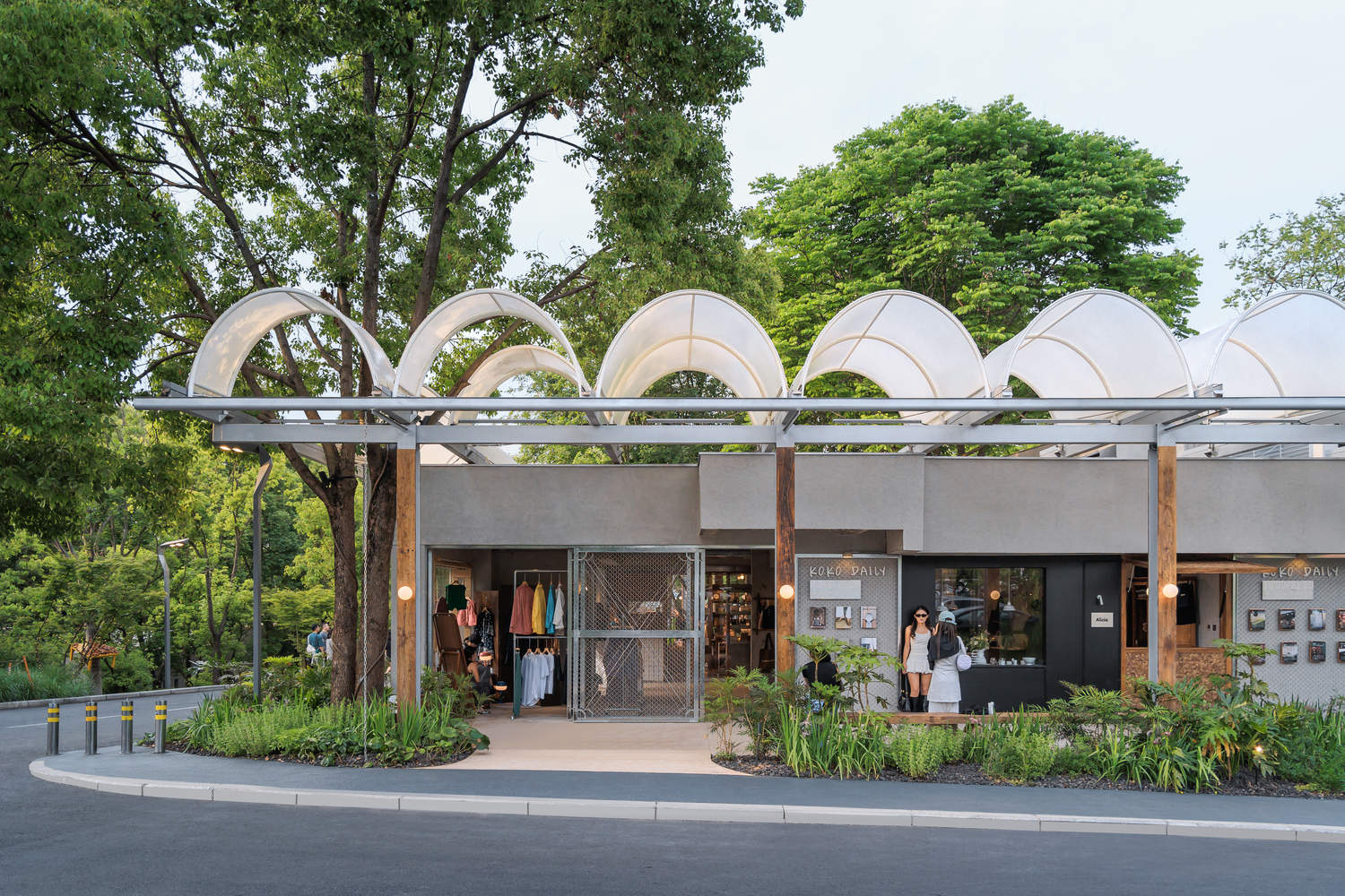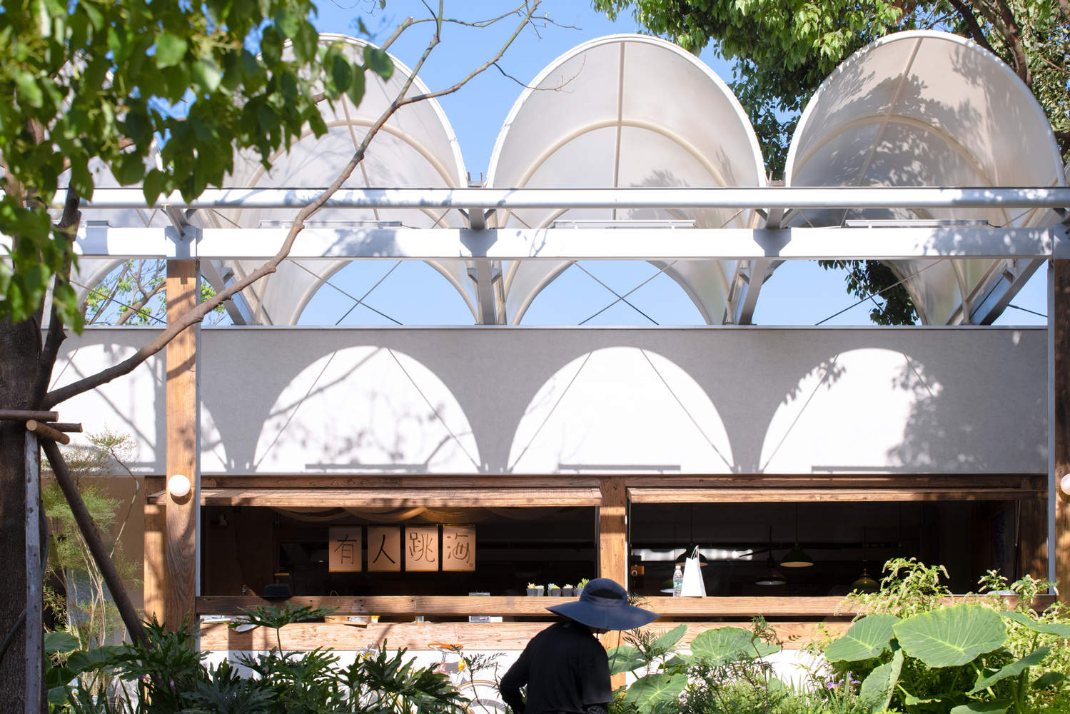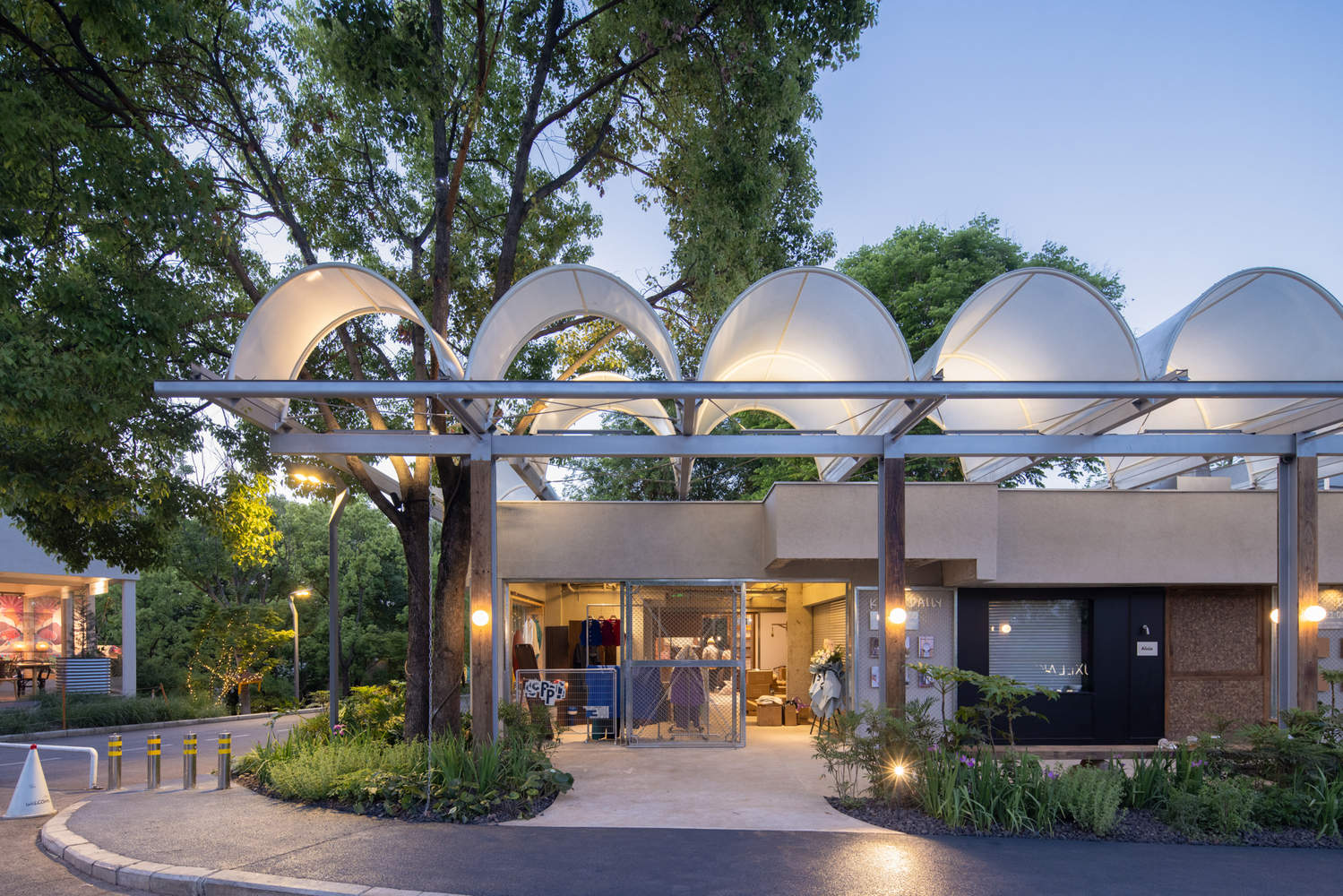 材料与光影的敏感性在本项目中尤其突出。拱顶的薄膜材料如同树叶一般在阳光下透射出柔和的光影,白天与夜晚交替变化,营造出充满诗意与灵性的空间感受。清水混凝土与裸露的钢结构梁柱、半包裹的老木头、攀援而上的藤蔓绿植,随时间和季节而自然演变,赋予建筑生命与情感。