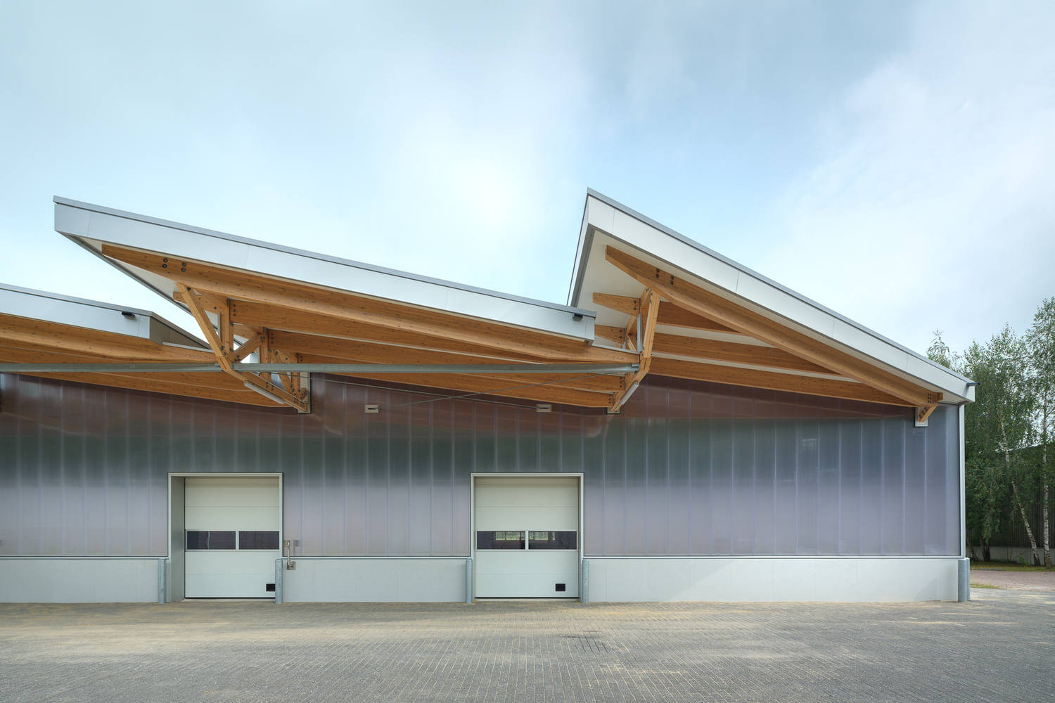 工作建筑由三个区域组成:发货区、(杂货)商店以及辅助/监督设施。为了使建筑的灵活性和适应性尽可能大,建筑由具有大跨度的桁架构成,可以在其中自由划分空间。立面和内墙不是承重墙,可以很容易地进行修改。建筑的稳定性由柱子之间两个方向的交叉支撑产生。在发货区域一侧,桁架形成了一个带有宽阔悬挑的雨棚,可以在干燥且遮蔽的环境下进行装卸作业。设计中的焦点是帮助囚犯从外部世界的视角来看待生活。通过将商店变成一个宽敞、明亮和舒适的空间,同时尽可能小心地将所有安全组件(隐形地)融入设计中。使用温暖而坚固的材料创造了一个能够经受撞击的工作环境,但外观却十分舒适。