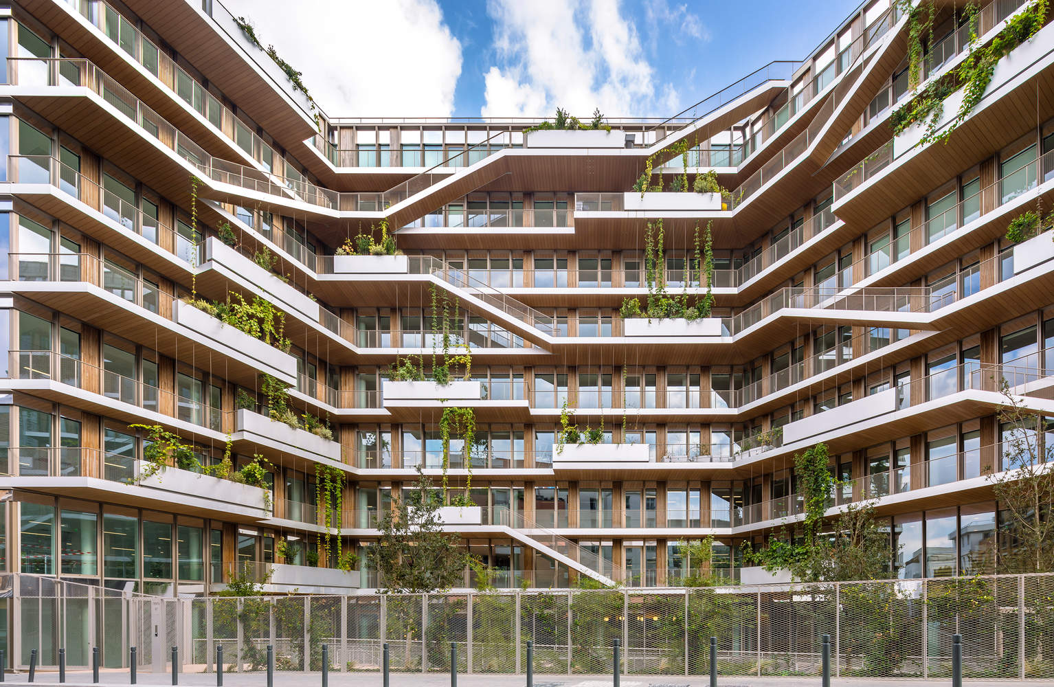 建筑立面的差异化处理强化了这种柔和的过渡。沿边界线的立面由并列的框架构成“统一纹理”。这种由多个模块组成的晶体表皮,给人以宏大的印象。另一方面,位于转折处的立面则布满了配备有绿植棚架的阳台。这些地方充满了惊喜,是户外工作空间,也是第三产业项目中的新型第三空间。一条由室外楼梯组成的网络将这些露台和花园连接起来,形成一条连续的路径。