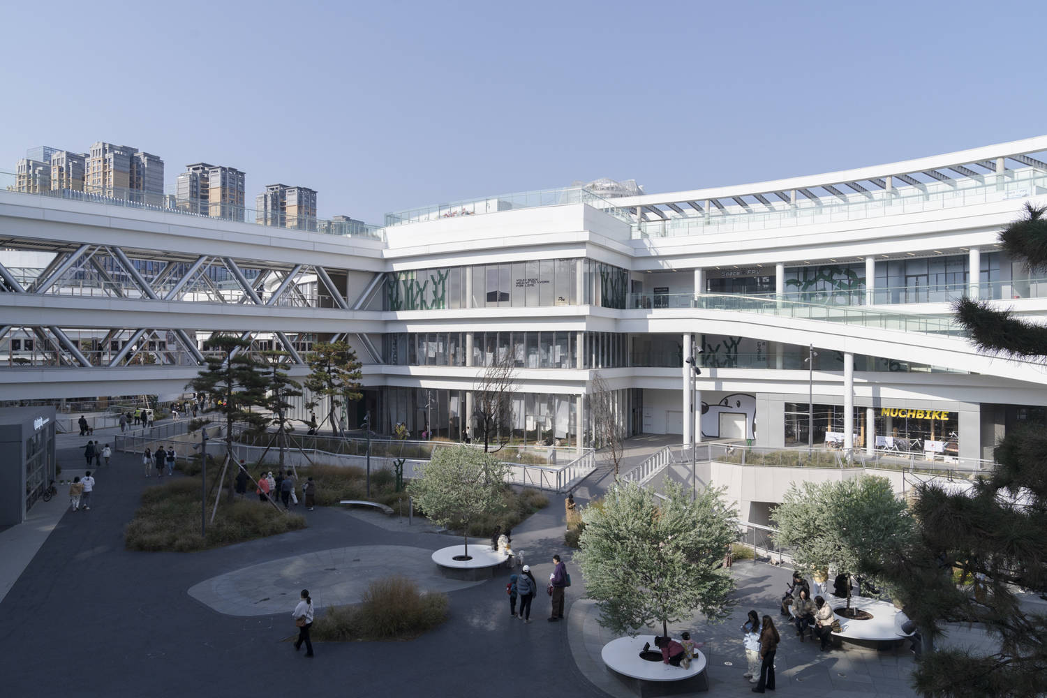 项目采用半开放街区的设计,建筑体块错落有致,通过四个文化性建筑与其之间的连廊等公共建筑围合起一个约 1 万多平米的底面及 4 层高的立体空间。这些空间相互连通,形成一个有机的整体。设计团队将原有场地的劣势通过“骑行”主题的融合转为了项目特色,再将改造预算重点配置到基础形态上,打造出一个具有特色的成长性商业空间。