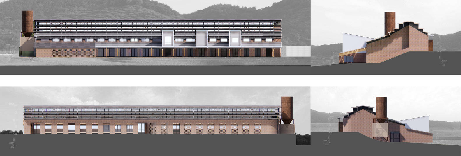 The project involves the renovation of an abandoned soil refining factory, with the Zhaoshan Reservoir and Dam to the west, a hillside to the south, and farmland to the north. The design continues the trend of the building crawling on the site, naturally connecting with the southern mountain and northern farmland, and overlooking the village. The main construction materials of the abandoned soil factory are red bricks and camphor pine logs. The structure and construction logic have two major characteristics: one is a strong sense of order and stunning visual effects; The other is to use the most economical materials to build the largest house. The updated design basically follows the original column grid and triangular roof truss form. After analyzing the stress, it is upgraded with steel bars for the tension rods and wooden structures for the compression rods, forming a simple and clear wooden frame main body.