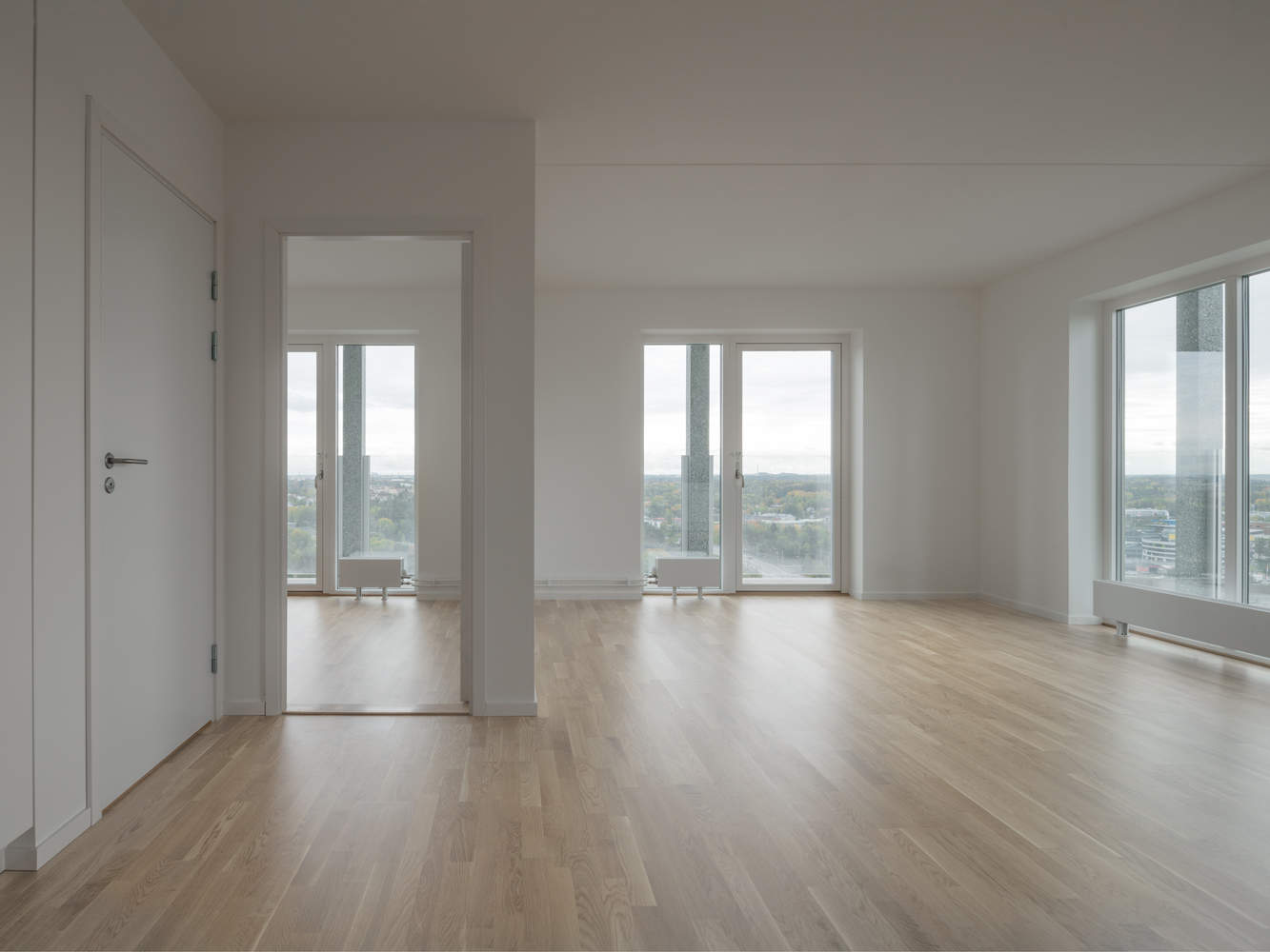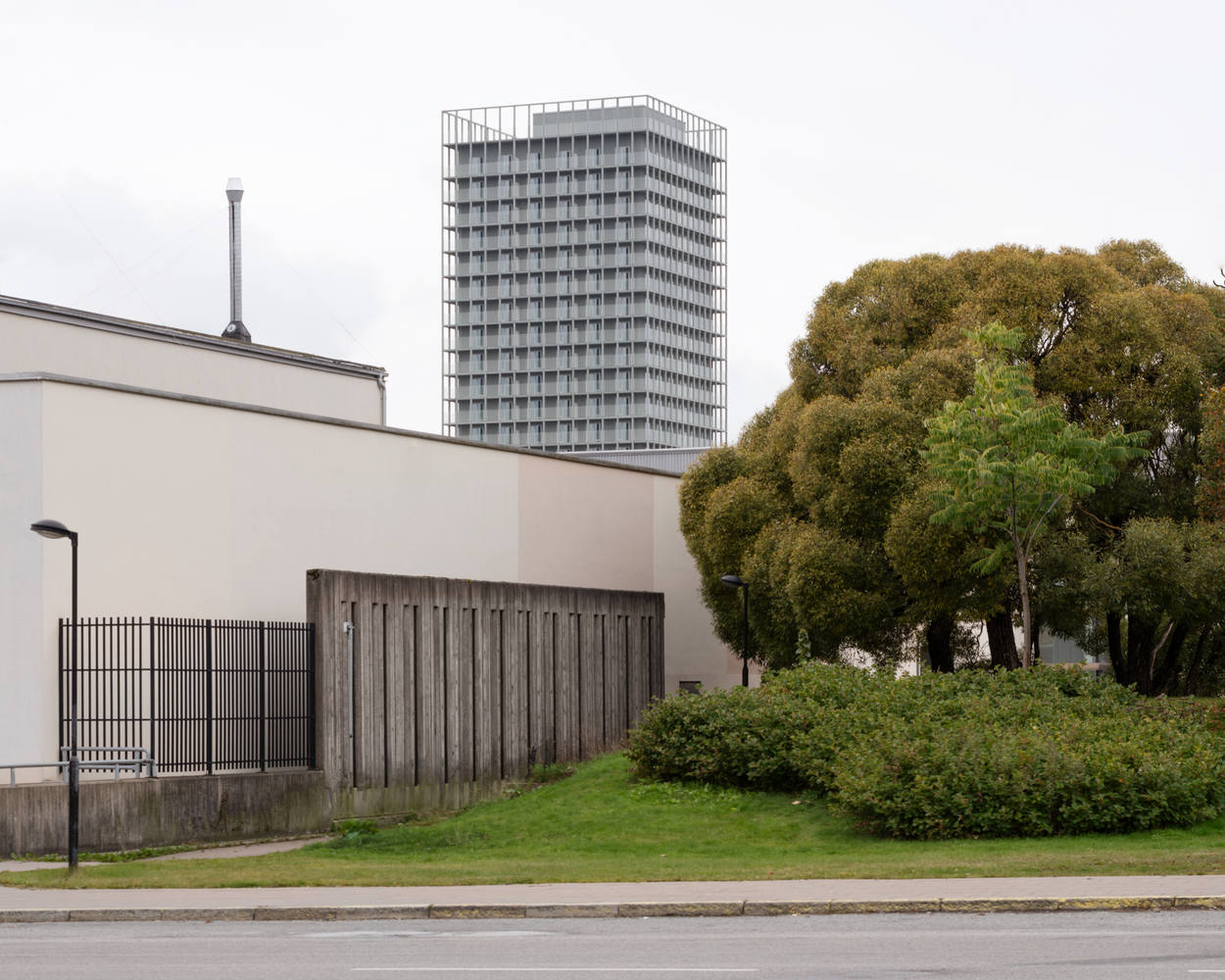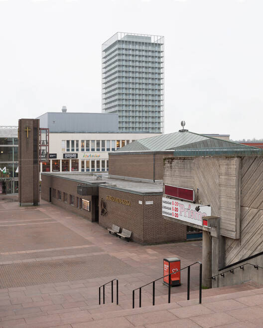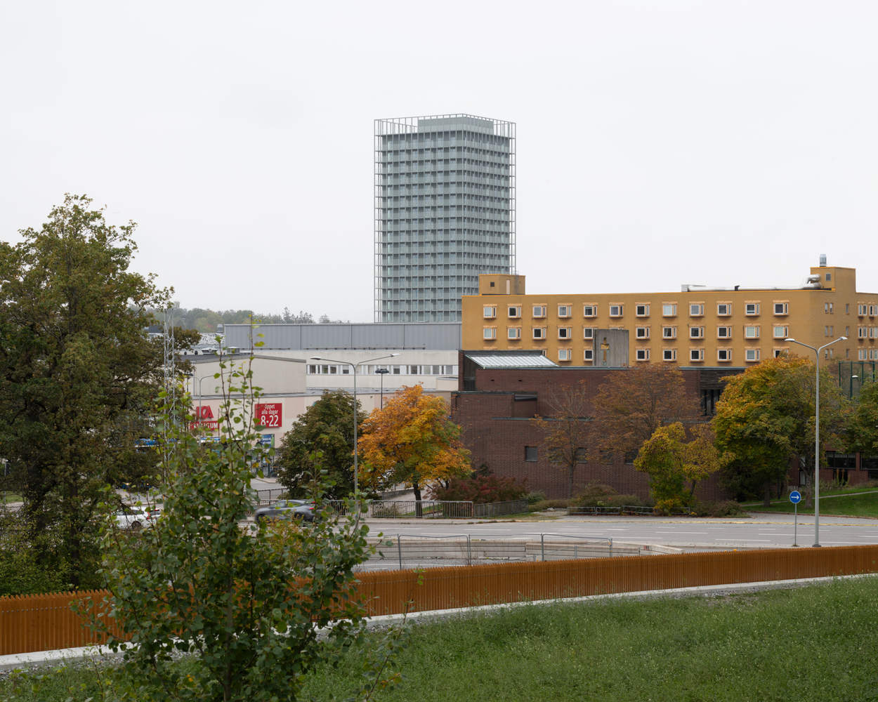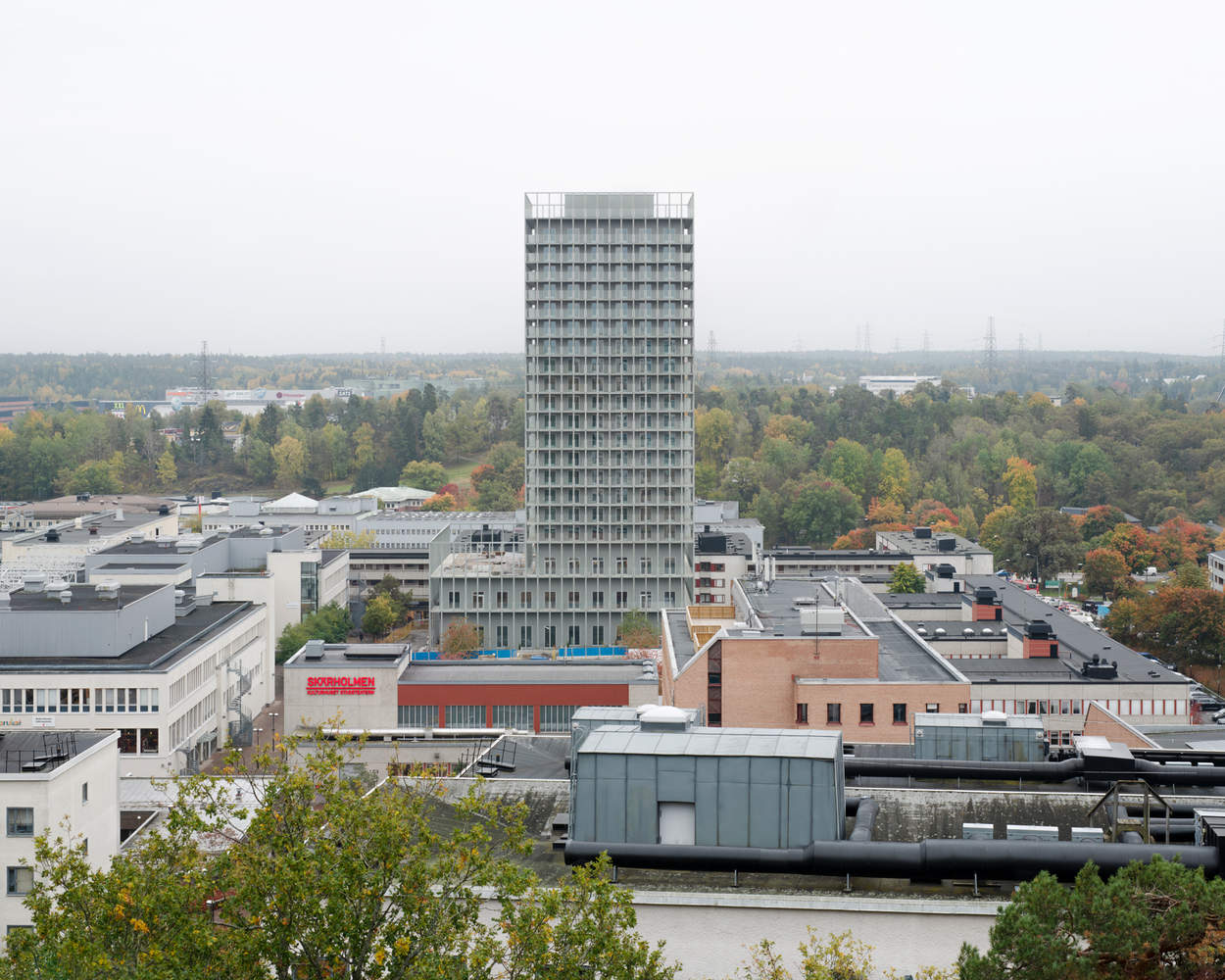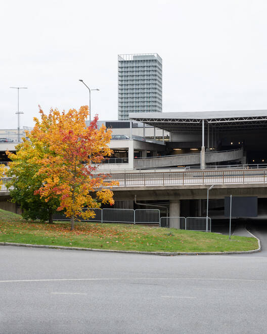 新建的 23 层高层建筑位于 Skärholmen 的中心,既与周围环境呼应,也与北部山坡上的阶梯住宅群形成对比。它不仅成为这一地区的地标,也在斯德哥尔摩市区中远近可见。建筑的结构采用了支柱架构系统,模块化的窗户和门设计通过每层阳台带的全覆盖玻璃栏杆实现,确保了建筑的透明感与现代感。屋顶设有绿化露台,供住户和工作人员使用。建筑的四个角落设置了入口,其中西南角设有一个公共、可达的入口供所有人使用。