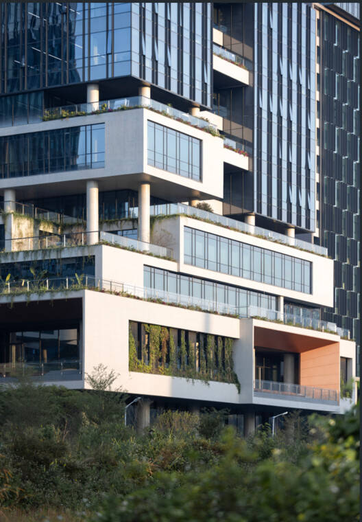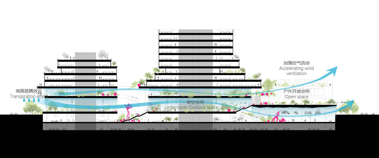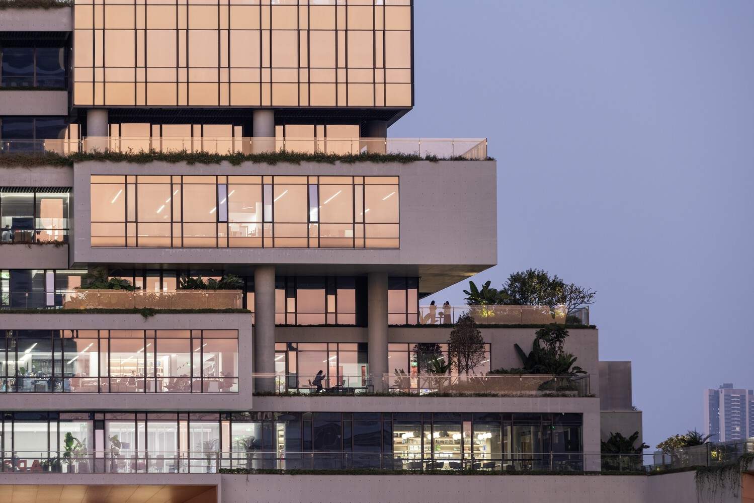 The design of "green content" in architecture is also based on the public and humanistic expression of the "natural theater", creating a green space that is in contact with nature and a shared place of interconnection and interaction in all aspects, creating breathable and naturally growing buildings and spaces.. Unlike traditional office buildings with enclosed floor spaces and single glass exterior walls, the project draws on common cultural architectural techniques to create a more three-dimensional and rich space. Firstly, the creation of a continuous green network, with outdoor terraces on each floor of the building, forming a continuous vertical green park from bottom to top, creating a pleasant resting space for people to stay. Next is the creation of design style, breaking through the conventional closed box image of office buildings and creating richly layered indoor and outdoor spaces. It is worth mentioning that a set of landscape windows have been set up on the second floor of the podium in different orientations, providing a close-up view of the park square. The theater, where the city and nature change every day, is staged in real time, allowing the building to radiate more enduring vitality over time. The floating platform in the tower integrates balconies, terraces, and shared spaces, providing a panoramic view of the East and West Hills from a high altitude. At the same time, in addition to the rich terrace and retreat spaces, the design cleverly utilizes the misalignment of the building structure, and opens indoor skylights that pour natural light into local spaces on lower floors, weakening the boundary between indoors and outdoors and bringing people closer to nature. The park actively responds to the urban development model of natural accumulation, natural infiltration, and natural purification, and sets up diverse green sponge facilities based on building and landscape conditions. Currently, the project has obtained the LEED green building pre certification in the United States.