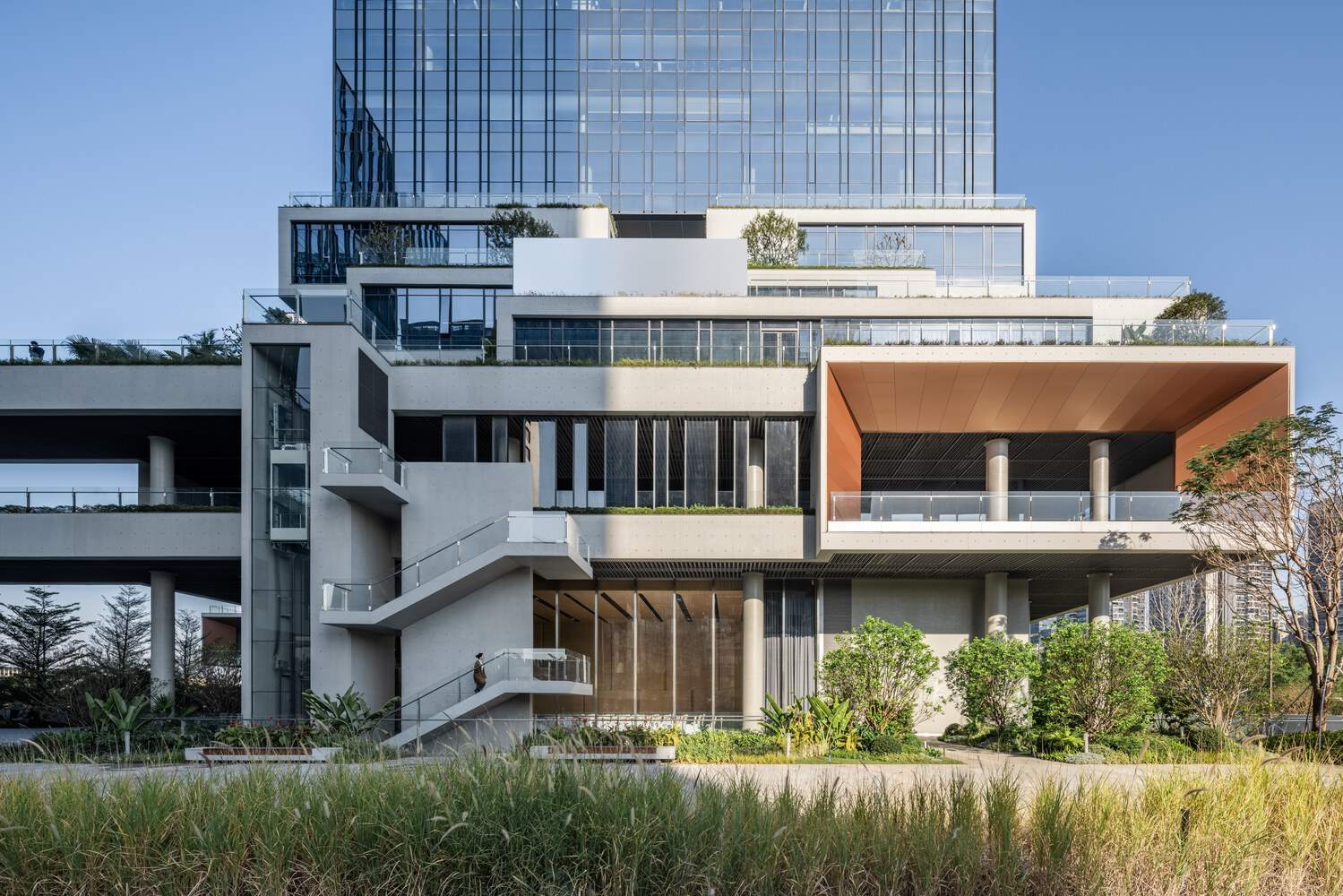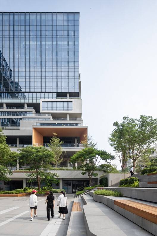 The initial conceptual thinking originated from Huayang International's reflection on the changes in office building design needs over the past 20 years.. How does architectural form reverse human mental states and behavioral patterns? What kind of living and office environment is needed for work? Should corporate headquarters create benefits for the wider public? The concept of 'natural theater' followed. The ancient Greek theater was a direct and thorough expression of public spirit, not only a place for watching plays and performances, but also a place for expressing personal thoughts and conducting gatherings and exchanges. We also hope to build a public platform in the city as an enterprise in this headquarters park, to recreate the original humanistic spirit of human society. In the overall layout of the park, three towers surround the sunken square, with audience platforms and windows on both the first and second floors, and stepped balcony terraces on each level. The sunken square below serves as the stage, while the stacked platform windows and terraces serve as the audience seats, forming a grand theater in the park that showcases stage plays of daily life at different times. The project is located in the business center area of Shenzhen North Station, adjacent to Shenzhen North Station to the east and Hongmu Mountain Country Park to the west. It is one of the urban interfaces of Shenzhen's "City of Design". Based on the "design" background of the park enterprises and the role of the site as a node of the urban greenway, the project will set the first and second floors as urban exhibition halls and urban parks respectively, forming a double layered composite public space, and connecting the east urban area, west suburban park, and south north station square through the second floor greenway. With a green and open attitude, it connects the mountains and the city, providing a space for the public to stop and communicate.