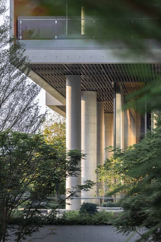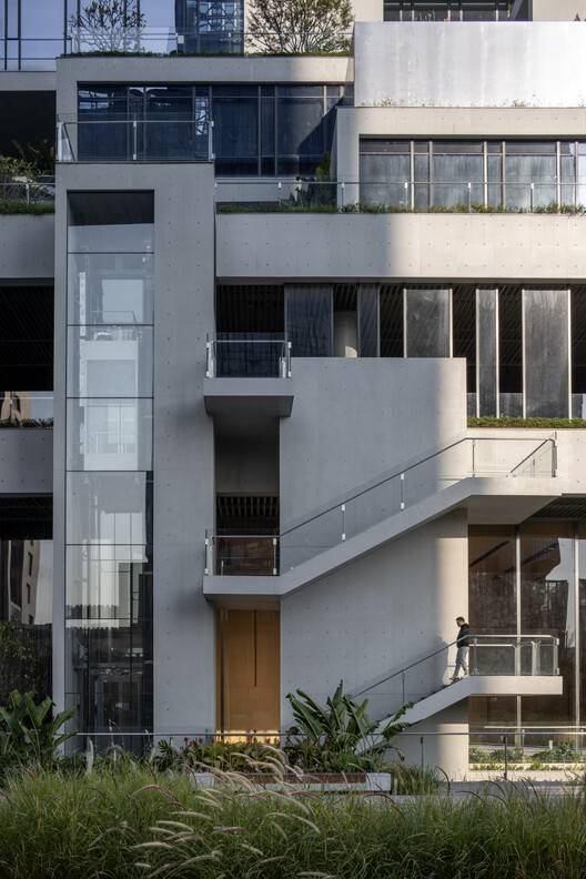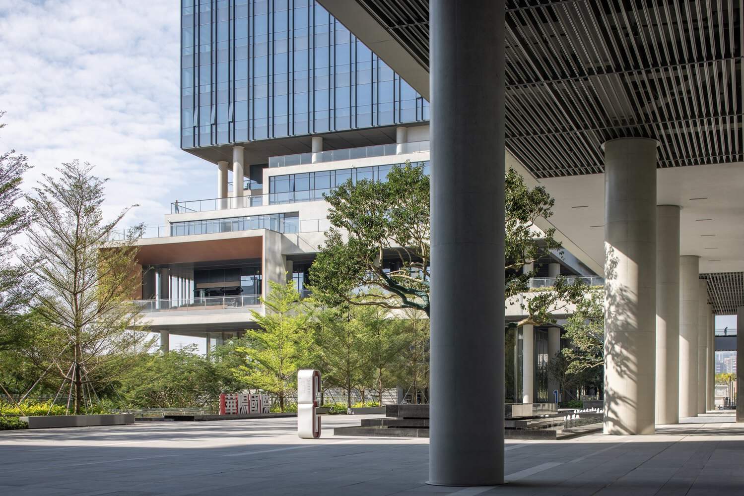 As the first engineering design industrial park in Shenzhen, we respond to design aesthetics with the most authentic materials. The project uses clear water concrete as the main building material, 108 clear water concrete wall columns, and approximately 24000 square meters of clear water concrete wall surface. It is poured and formed in one go with millimeter level construction accuracy, achieving the texture of an art exhibition hall and carrying the sediment of time. The interweaving of light and shadow under different sky conditions constantly conveys natural emotions and provides users with immersive spatial experiences between different textures. The biggest feature of the exterior wall is the hidden design of the glass curtain wall. At the junction of the plain concrete wall and the curtain wall, a groove structure is used to achieve the effect of hiding the curtain wall frame. By weakening the components, the details are visually "disappeared", creating a strong contrast between the heaviness of plain concrete and the lightness of glass, shaping a pure and concise artistic conception, and conveying the humanistic style of the design enterprise.