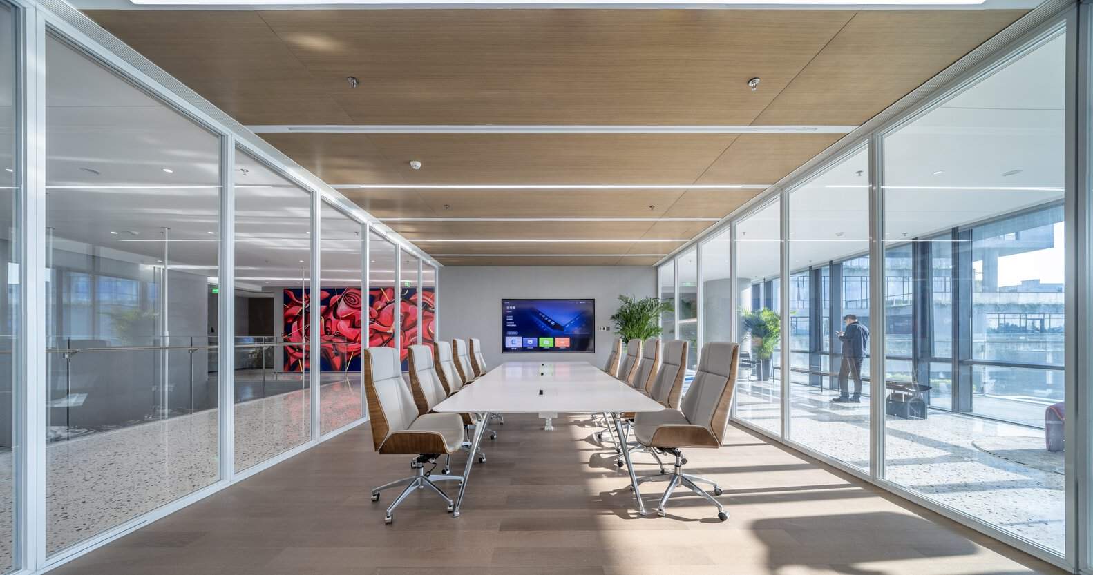 室内:触发灵感的精神场域:室内设计延续了开放和共享的理念,力求打造一个能够激发灵感的工作场所。项目取消了大量实墙,将各个功能空间(如会议室、展厅)设计成独立的“艺术品”,营造出在城市中漫游的体验。这种设计模糊了功能之间的界限,赋予空间更大的灵活性,员工可以自由选择工作环境。垂直中庭的设置打破了水平和垂直空间的界限,促进了交流与互动。通透的玻璃和观景窗将室外环境引入室内,模糊了室内外的界限,最终实现了建筑与环境的完美融合。这些设计细节体现了对使用者体验的关注和对设计公司文化的深刻理解。