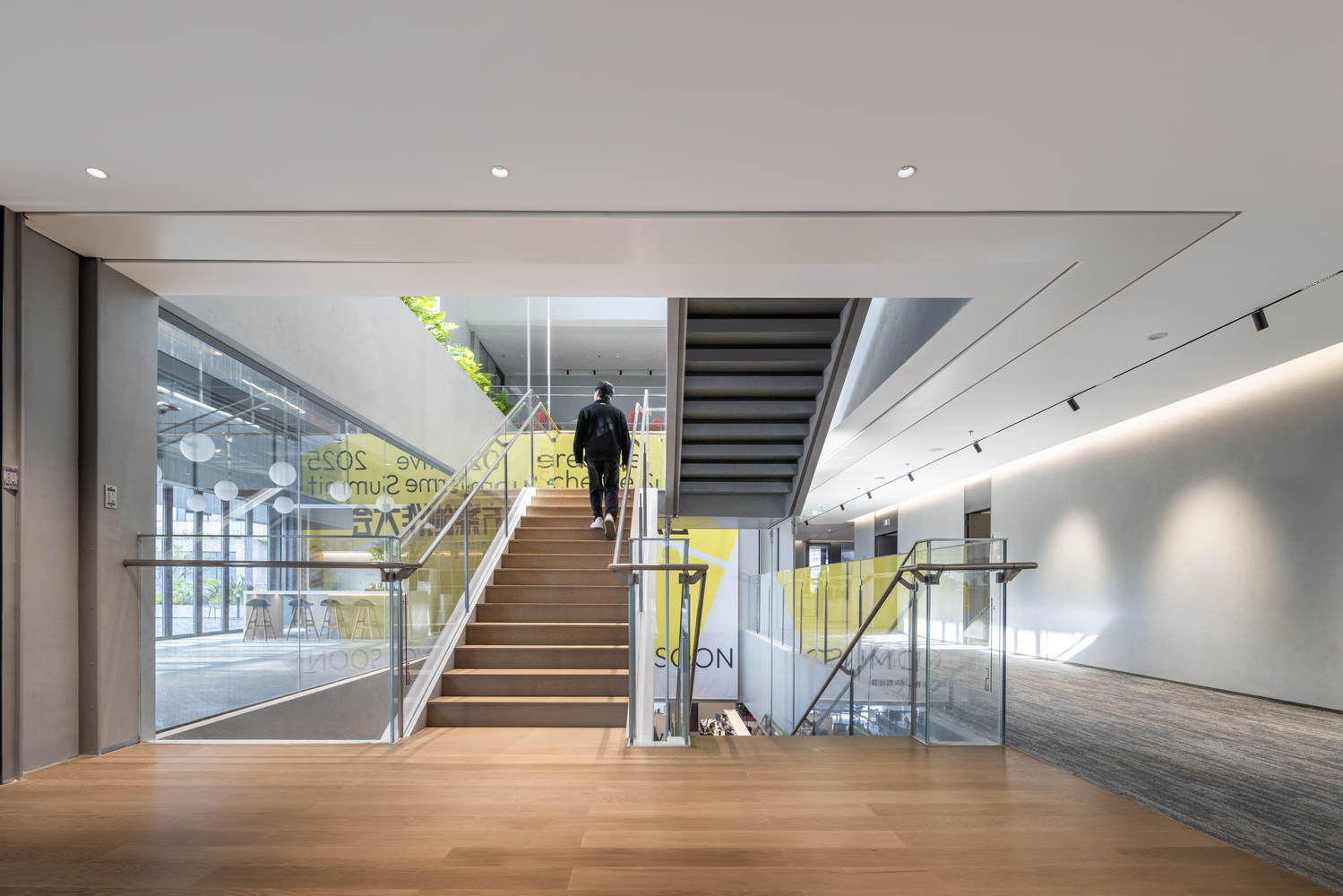 Returning to the interior space, as the office headquarters of a design company, what kind of space do designers aspire to?? Firstly, it should be cultural, paying more attention to the humanistic needs and emotional experiences of users; Secondly, it should be open to promote work communication and inspire inspiration, which is also a response to the theme of "natural theater". A space that can be infinitely extended, making the building a headquarters building, not only carrying the function of office, but also a platform for people to gather, communicate, experience and share emotions and culture. We have also innovatively introduced the approach of cultural architecture, eliminating a large number of physical walls. On both sides of the "street" space inside the building, each functional room such as a conference or exhibition hall is displayed as an independent artwork, creating an outdoor feeling as if wandering in the city. The boundary between functions is blurred, and the overall space is more flexible, providing people with the freedom to choose and switch between different environments such as independent privacy and shared openness. The layers are connected by a vertical atrium, breaking the boundaries between horizontal and vertical spaces and stimulating more vitality and communication. The transparent glass and occasional "observation windows" actively introduce the outdoor environment into the interior. At night, the diffused light from the interior permeates the quiet working and constantly moving images into the outside, further blurring the boundaries between indoor and outdoor, and integrating the building with the environment.
