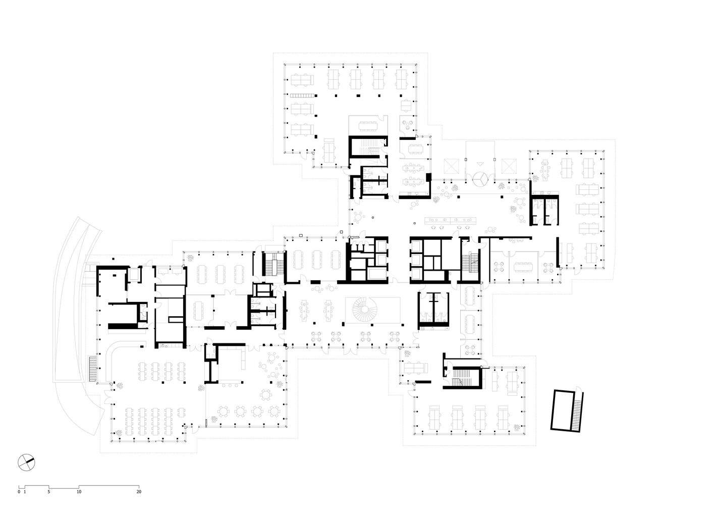建筑内部,一个新的中庭将办公室和出租单元连接起来,鼓励部门间的互动和知识共享。这个充满阳光的空间为建筑使用者提供了一种身份感和归属感,增强了社会可持续性。中庭还改善了空气流通和自然采光,创造了一个更健康、更宜人的工作环境。