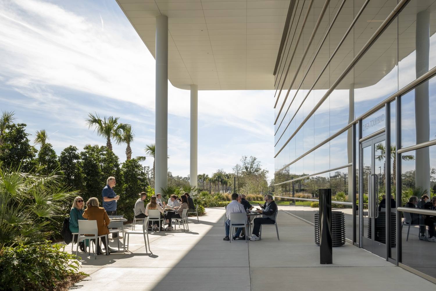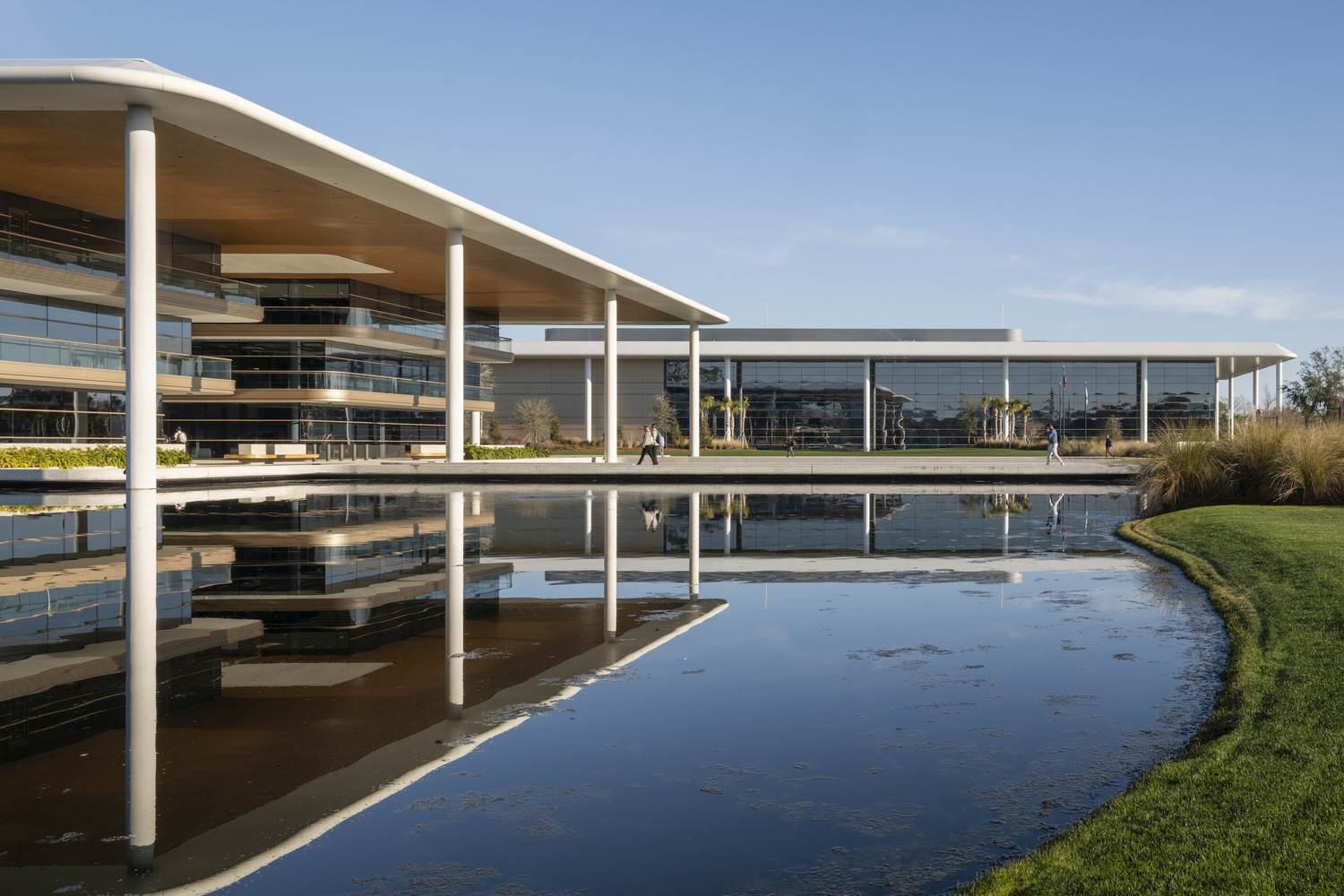 Transportation and Connectivity - The building is adjacent to the global headquarters, with scenic walking paths and golf cart access between the buildings. It shares facilities such as a gym, other dining facilities, and meeting spaces. The parking lot provides electric vehicle charging services.