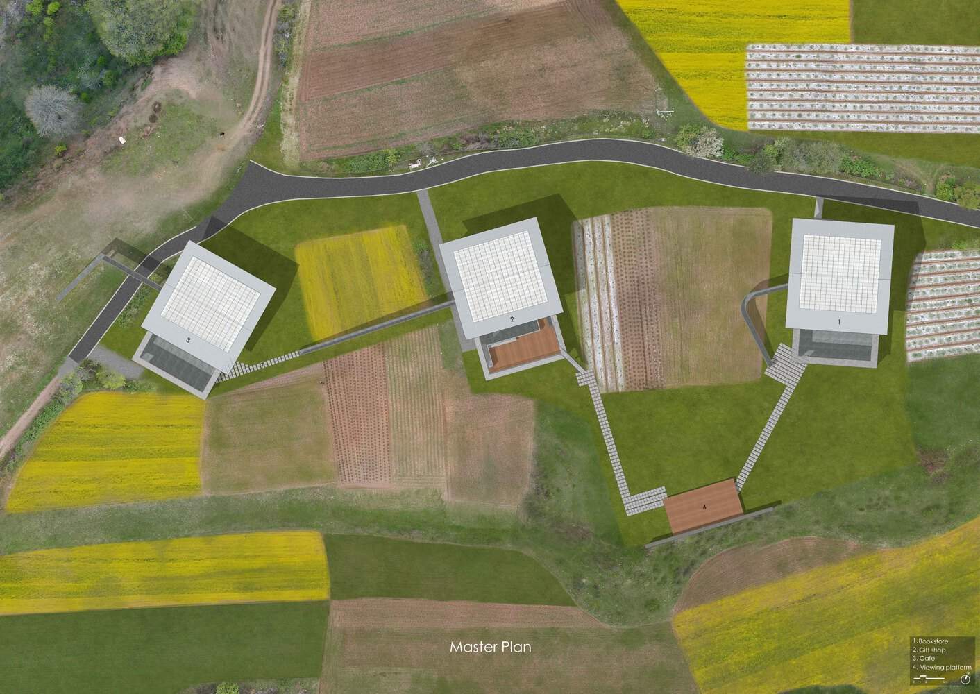 In order to avoid farmland, the bookstore's corridor extends and bends back, landing at the courtyard gate. Then walk south along the field to an outdoor platform. There used to be a low wall here, like some kind of boundary defining existence. This location has been separated from the three storage rooms, providing a perspective to look back at the whole picture. Then head west towards the cultural and creative goods store, climb half a level of stairs to reach the terrace, from where you can overlook the continuous pine forest that stretches all the way to the distant Haba Snow Mountain. Passing through the interior of the cultural and creative store, a 30 meter long ramp rises above the barley field, and walking straight down is the back door of the caf é courtyard. The corridor of the caf é extends straight towards the direction of the reservoir, and after completing the observation of the vast forest in the distance, it climbs down to approach the deeper nature.