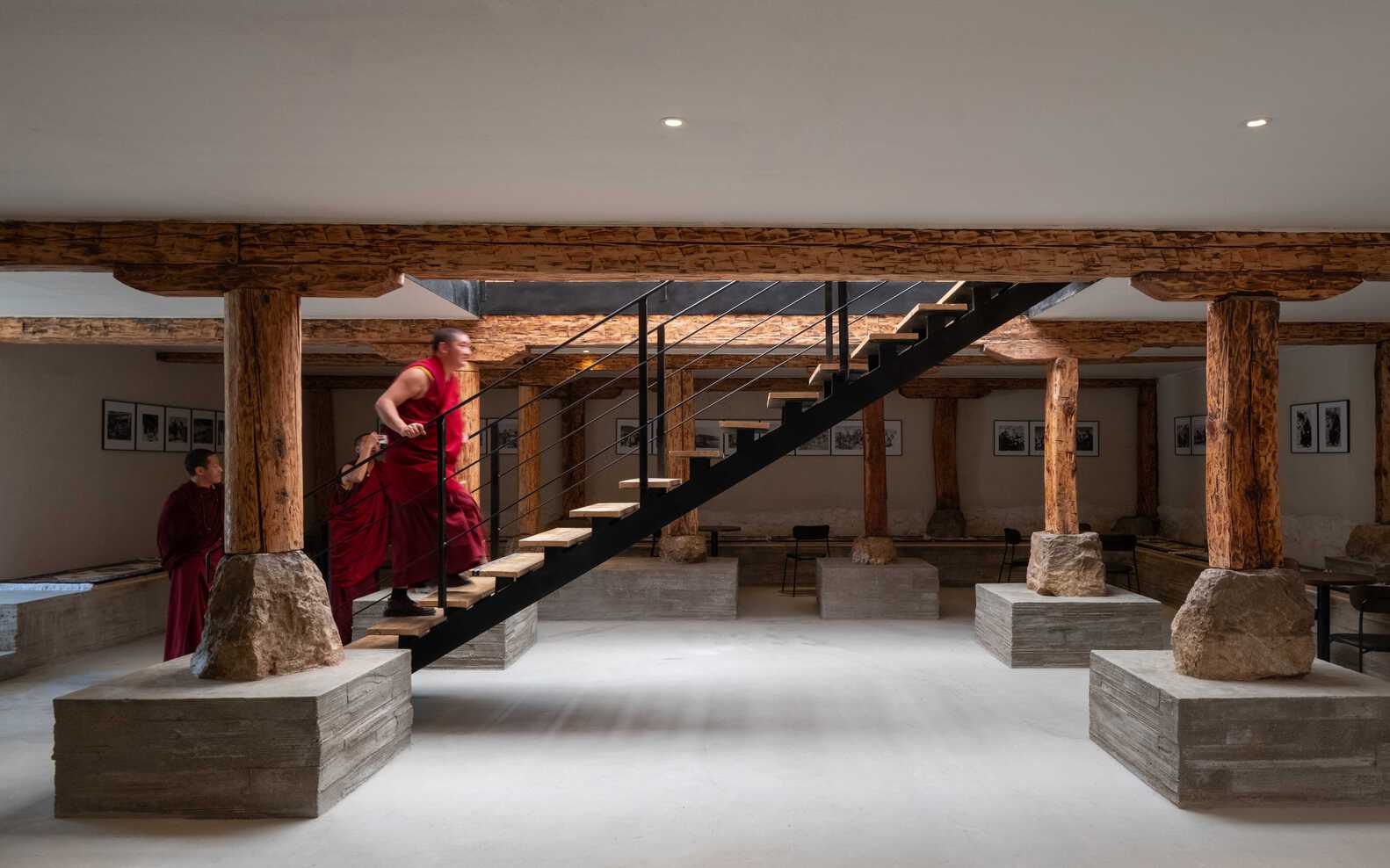咖啡馆需要强化其经营属性,二层空间明亮舒适但不够用;地面层的牲口棚太矮,幽闭而压抑。于是我们把牲口棚的地面挖下去四十五公分,夯土墙底部基础放大一圈儿成为坐凳,原来用作柱础的石墩被新浇筑的混凝土方墩承托起来,牲口棚因此意外地收获了一个被托举陈列的效果。咖啡馆不需要完整的大空间,老藏房的房间划分正好为咖啡馆提供了空间分区和空间场景,尤其是火塘周围的起居空间——神龛、壁画、木制窗套和水亭——本身就耐人寻味。