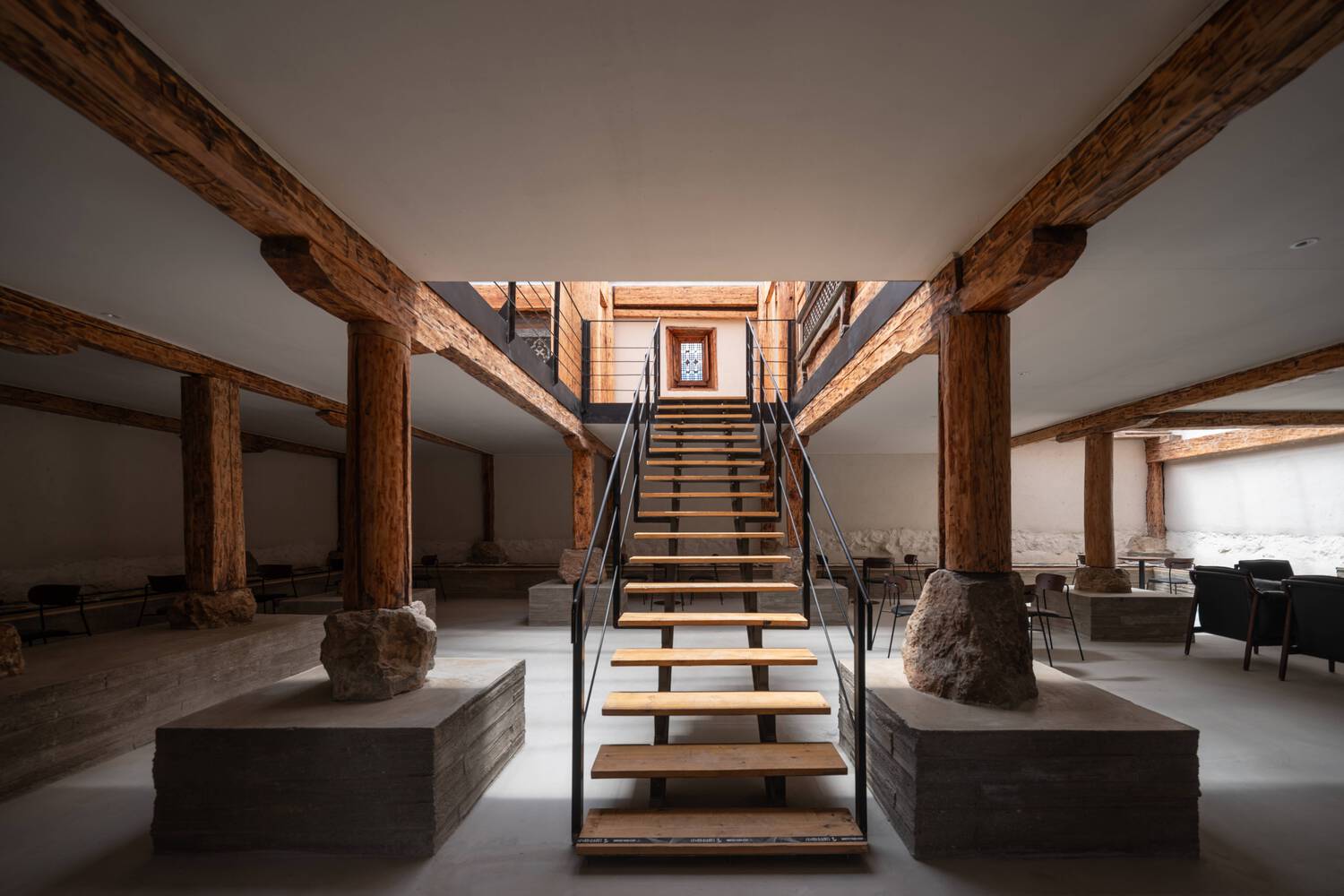 The coffee shop needs to strengthen its business attributes, as the second floor space is bright and comfortable but not sufficient; The ground level barn is too short, secluded and oppressive. So we dug 45 centimeters down from the ground of the barn, enlarged the foundation at the bottom of the rammed earth wall to become a stool, and supported the stone pillars that were originally used as column foundations with newly poured concrete square pillars. As a result, the barn unexpectedly achieved a lifted display effect. Coffee shops do not require a complete large space, and the room division of the old storage room provides space zoning and spatial scenes for the coffee shop, especially the living space around the fire pit - shrines, murals, wooden window frames, and water pavilions - which are already intriguing.