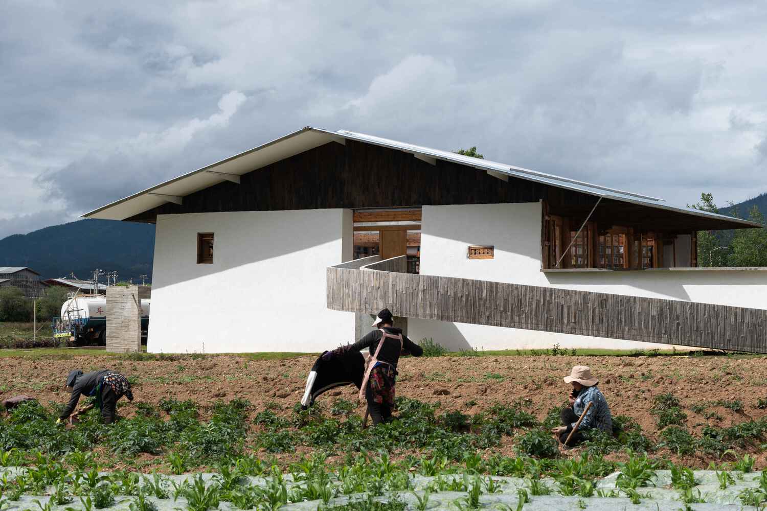 在这个传统手艺快速消亡的时代,即使是在云南,天然的材料、手工的做法也开始变得稀缺和昂贵,甚至会跟越来越无所不在的环保法规发生抵牾。也许越是遥远的乡村,越应该利用工业化的建造体系。轻钢结构和阳光板的屋顶是整个施工过程中最让我们省心的环节(除了始料未及的木结构梁顶找平工序)。书店主入口的门头和三个伸向大地的廊道用混凝土浇筑,考虑到农村施工队有限的支模技术和精度,我们索性就用从老藏房屋顶拆下来的木闪片来作模板。木闪片纹路深,浇筑成型的混凝土表面非常斑驳,反倒是和整体上粗放的施工显得匹配。回收的木闪片还有一个去处,就是用作坡屋顶山墙部分的饰面和悬挑部分的吊顶。这些久经风霜的木闪片刷上清漆后呈现出黑褐色,在用草筋白涂刷的墙面和闪亮的波纹板之间,加入了一个沉着的色调。